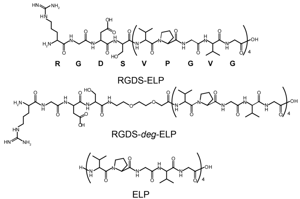 Primary structures of the thermo-responsive elastin-like oligopeptides containing cell-binding RGDS epitope (RGDS-ELP, RGDS-deg-ELP) used as building units for self-assembled molecular layers. V: valine, P: proline, G: glycine, R: arginine, D: aspartic acid, S: serine.