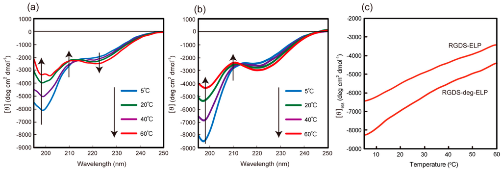 Temperature-dependence of circular dichroism (CD) spectra of (a) RGDS-ELP and (b) RGDS-deg-ELP in 5 mM citric/phosphate buffer (containing 5% TFE) at pH 7.4. [peptide] = 50 μM. (c) Temperature profiles of [θ]198 values for RGDS-ELP and RGDS-deg-ELP at heating process.