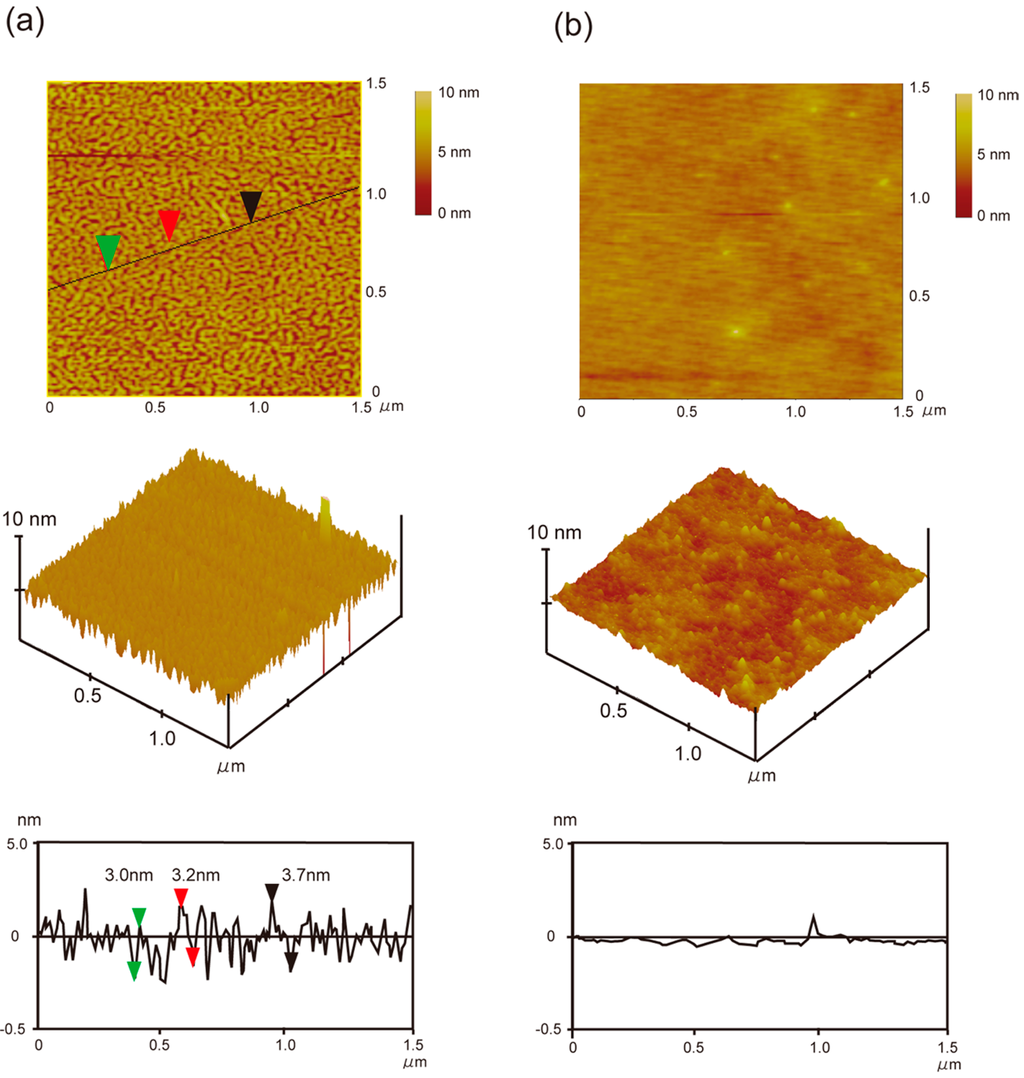 The self-assembling behavior of oligo(ELP)s with RGDS epitope onto hydrophobic substrates using the thermo-switchable conformation of the ELP segment was examined in order to fabricate the molecular layer for artificial ECM. Recently we have reported an effective and facile method for gold nanoparticle arrays guided by thermo-responsive oligo(ELP) [28]. Using such smart character of oligo(ELP) as a molecular guide, the 2D-organization of bio-functional groups will also be accomplished. To elucidate the selective adsorption of the oligo(ELP)s with RGDS epitope onto a solid substrate, we firstly prepared two glass substrates, a hydrophobic glass plate treated with octadecyltriethoxysilane and an untreated bare glass plate, providing hydrophobic (water contact angle: 115°) and hydrophilic (water contact angle: 20°) surfaces, respectively. The interaction of these glass plates with oligo(ELP)s was examined by separately immersing them into aqueous solutions of oligo(ELP)s (0.1 mg·mL−1) at 4 °C and then incubating overnight at 37 °C above the conformational transition temperature, and was confirmed via visualization with atomic force microscopy (AFM). AFM is a useful technique to evaluate the 3D structural features of a surface in nano-meter scale. It is, however, well known that the convolution of the scanning tip leads to an overestimation of the sample’s width. All sample dimensions were therefore estimated from the height of the surfaces in cross section.