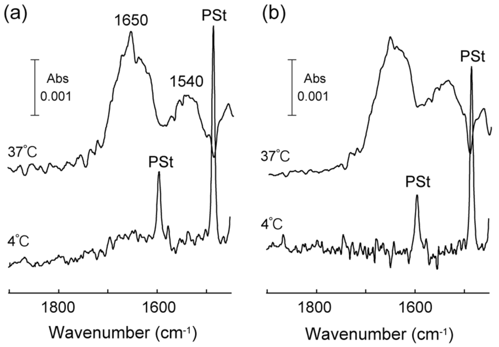 ATR-FTIR spectra of the self-assembled molecular layers of (a) RGDS-ELP and (b) RGDS-deg-ELP on PSt-dish prepared at 37 °C and 4 °C.