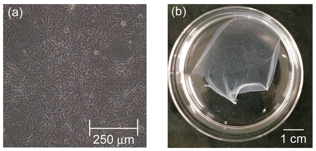 (a) Phase-contrast microscope image of NIH/3T3 cell on RGDS-ELP-layer at 37 °C. (b) Photograph of cell-sheet recovered from the confluent cell (as shown in Figure 6a) by cooling to 20 °C.