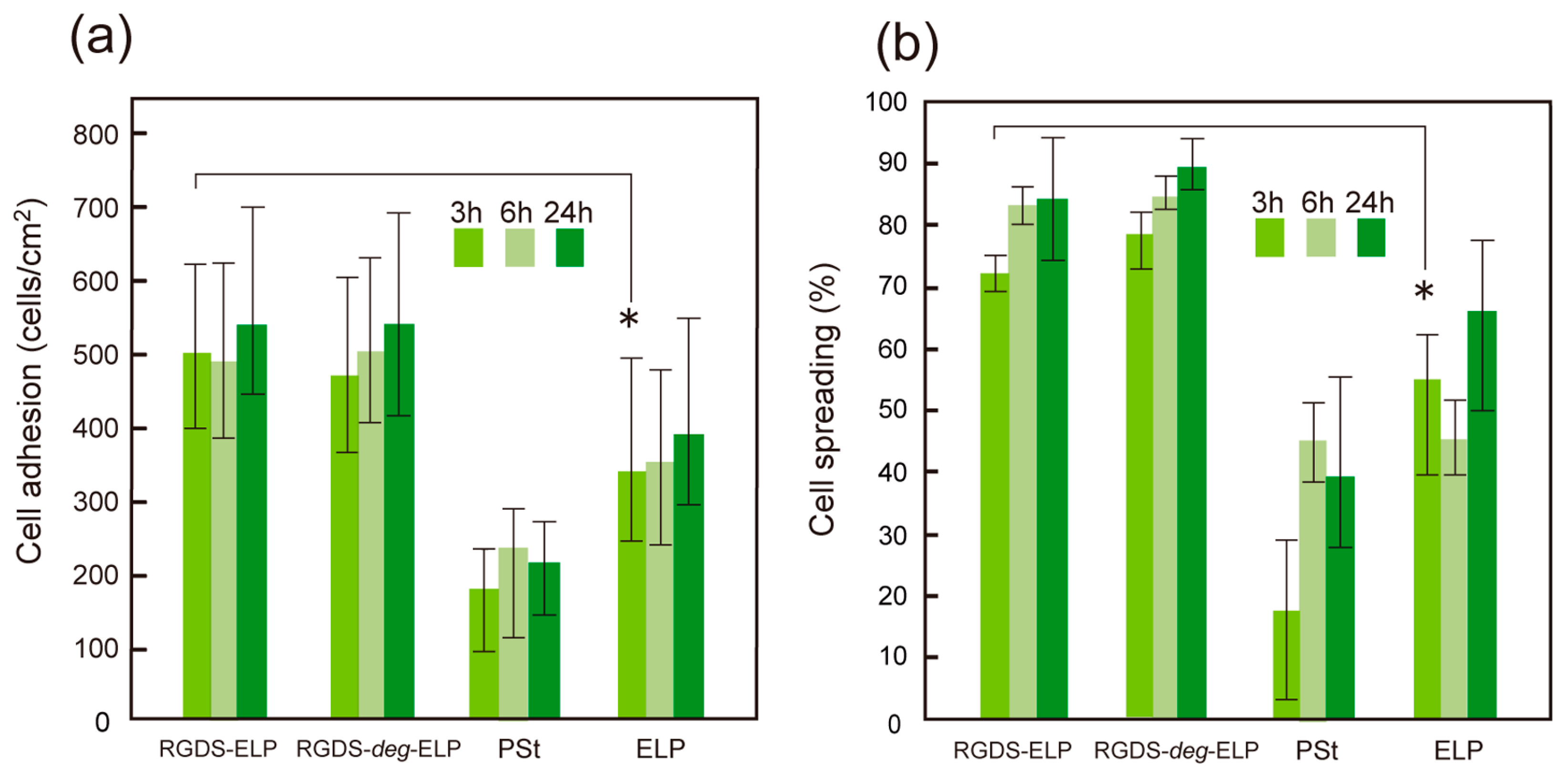3.2. Thermo-Induced Self-Assembly of Oligo(ELP)s Containing Cell-Binding Domain onto Hydrophobic Surfaces