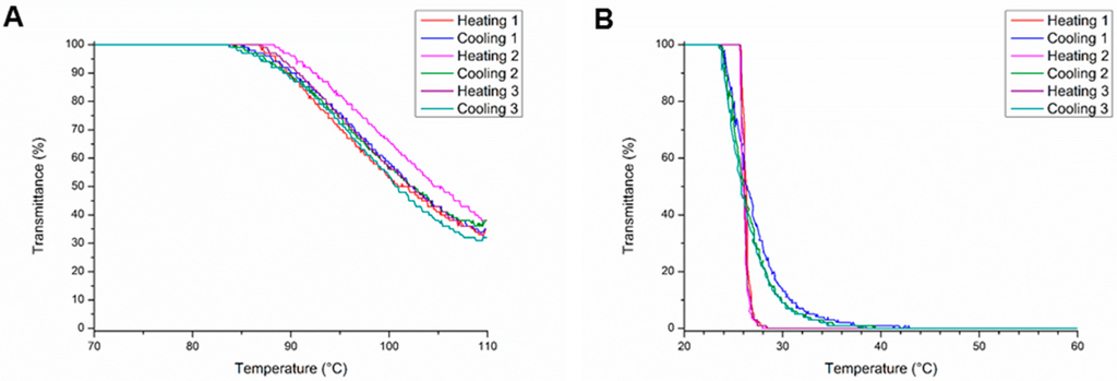 Turbidity measurements were performed on an Avantium Crystal 16 platform (Avantium: Geleen, The Netherlands). Solutions of the polymers were prepared in milliQ (WaterPro PS polisher from Labconco: Kansas City, MO, USA) water with a conductivity of 18.2 MΏ/cm at 5 mg·mL−1 and were stirred at room temperature until all polymer was dissolved. Three heating cycles were applied with a heating/cooling rate of 1 °C·min−1, temperature ranges of 5–45, 20–60, 20–75, 60–105 or 70–110 °C were used depending on the polymer, and withhold steps of 5 min at the extreme low temperatures, no hold time was applied when the samples were heated above 100 °C; all measurements were performed with a stirring rate of 700 rpm. The cloud point temperatures are given as the 50% transmittance point during heating. GC vials with open caps and septa were used for these measurements allowing heating until 110 °C with minor pressure build up as noticed by slight expansion of the septum.