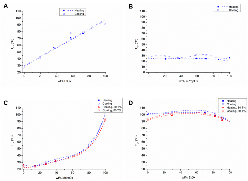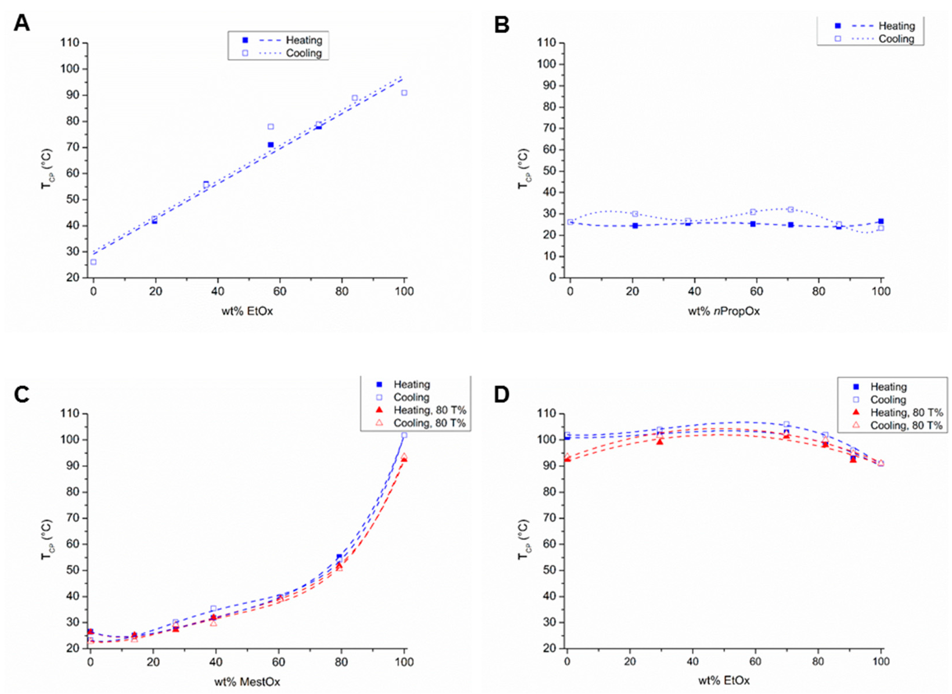 Cloud point temperatures (TCP; determined at 50% transmittance unless otherwise stated) as a function of polymer composition of (A) P(EtOx–C3MestOx), (B) P(nPropOx-C3MestOx), (C) P(nPropOx–MestOx, and (D) P(EtOx–MestOx); lines are added to guide the eye.