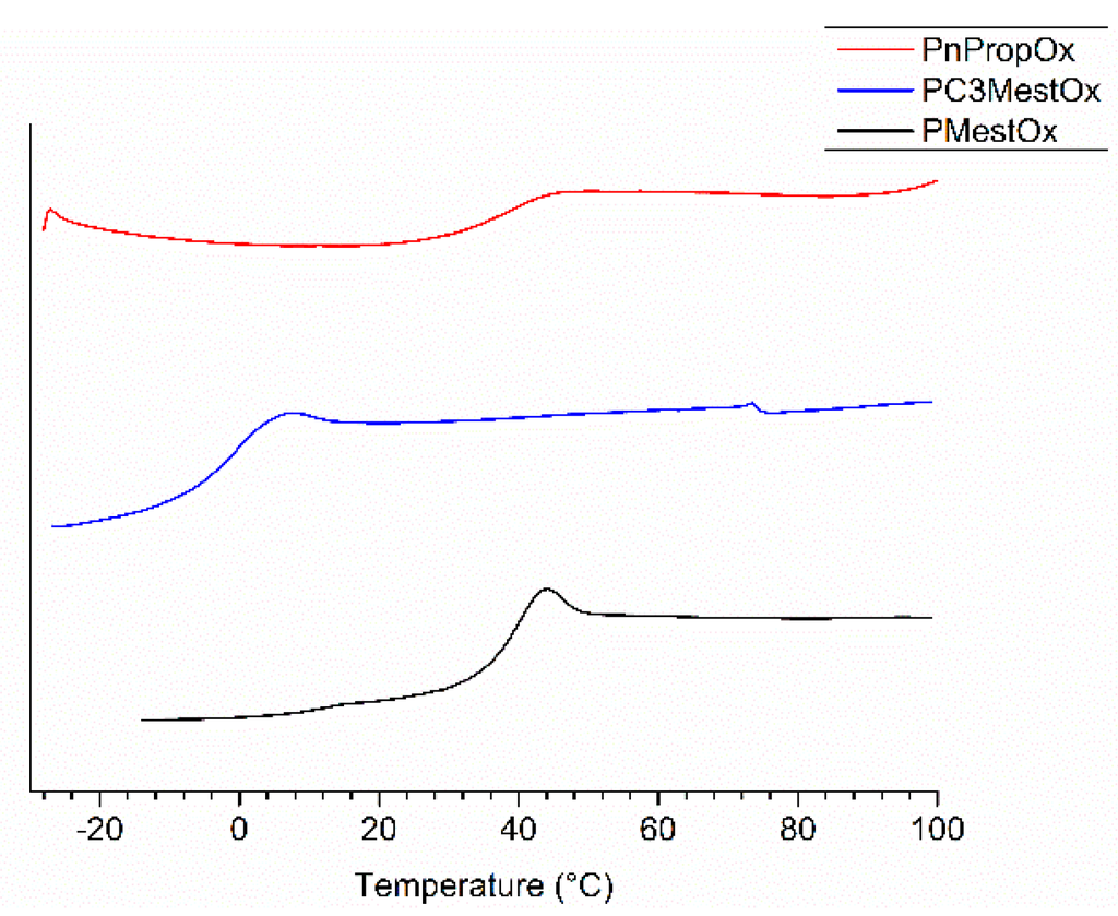 DSC traces of second heating run (10 K·min−1) of PMestOx, PC3MestOx, and PnPropOx homopolymers.