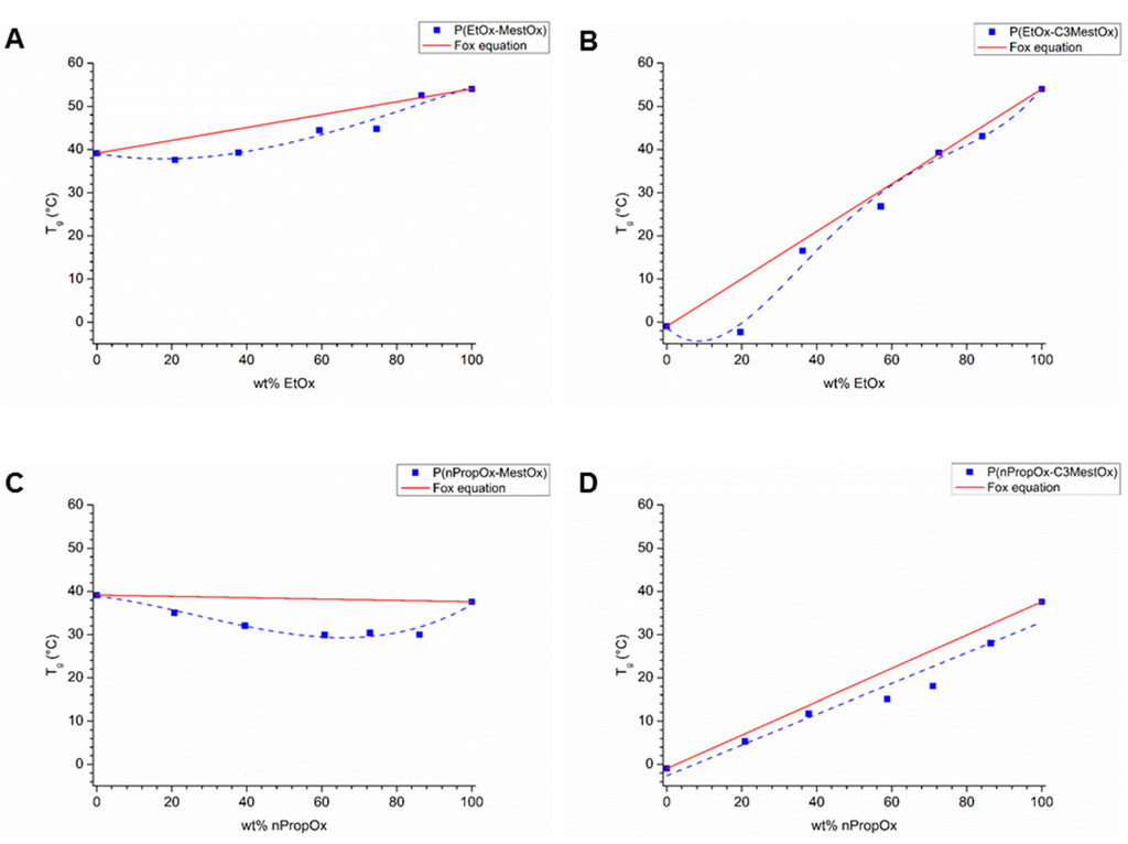 Glass transition temperatures as function of polymer composition of (A) P(EtOx–MestOx), (B) P(EtOx–C3MestOx), (C) P(nPropOx–MestOx), and (D) P(nPropOx–C3MestOx). Lines are added to guide the eye; the red line indicates the Fox equation.