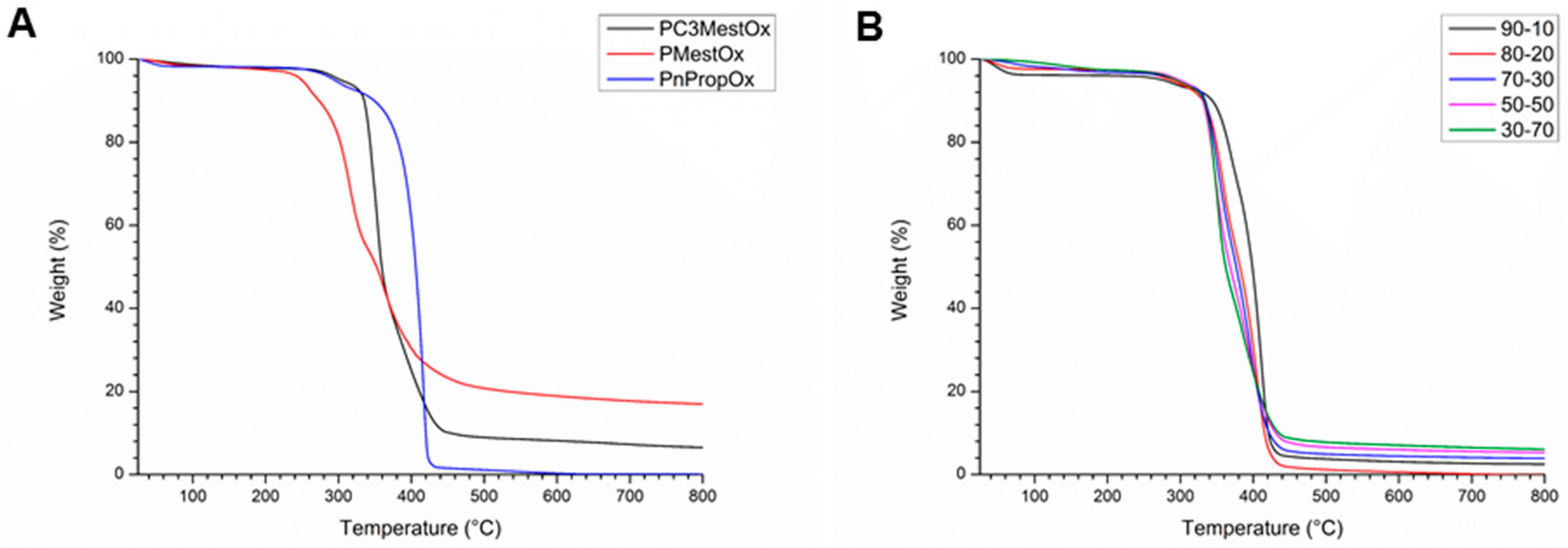 Thermogravimetric analysis of (A) PMestOx, PC3MestOx, and PnPropOx homopolymers and (B) P(EtOx–C3MestOx) copolymers.