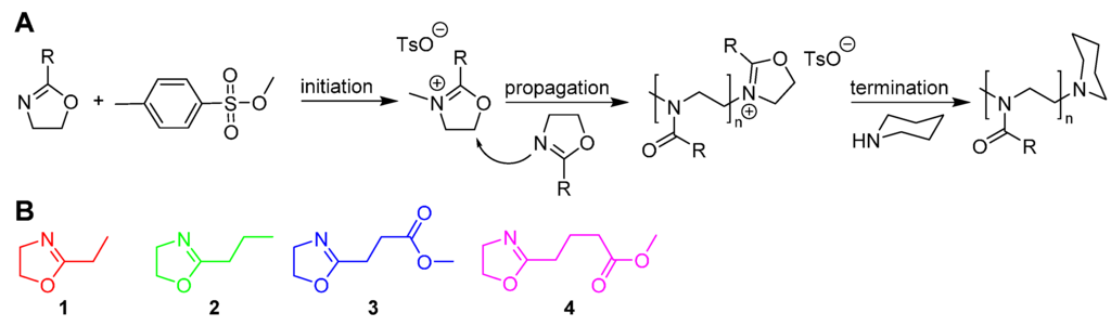 (A) Cationic ring-opening polymerisation of 2-oxazolines with methyl p-toluenesulfonate as initiator and piperidine as terminating agent and (B) Monomer structures of EtOx (1), nPropOx (2), MestOx (3) and C3MestOx (4).
