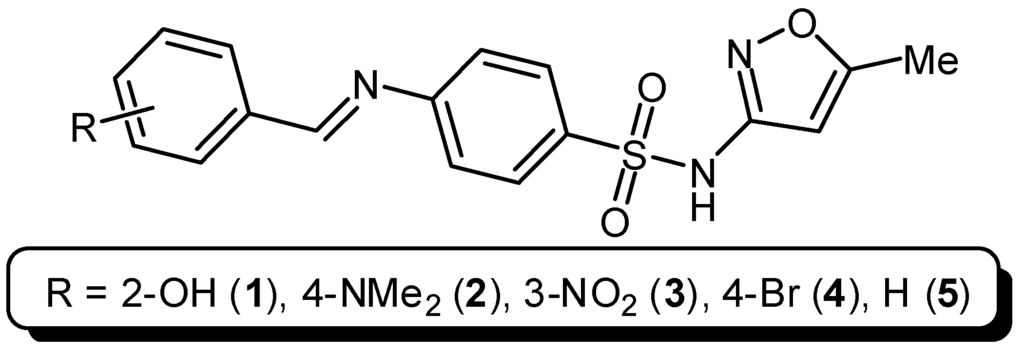 Several Schiff’s bases 1–5 (Table 1 and Figure 1) having sulphamethaxazole moiety were synthesized based on a literature procedure [23] from reactions of sulphamethoxazole and aromatic aldehydes, namely 2-hydroxybenzaldehyde, 4-dimethylaminobenzaldehyde, 3-nitrobenzaldehyde, 4-bromobenzaldehyde and benzaldehyde, in ethanol in the presence of few drops of glacial acetic acid as a catalyst under reflux condition for 12 h. The mixture was left to cool down and the solid produced was filtered, washed ethanol and recrystallized from ethanol to give 4-(2-hydroxybenzylideneamino)-N-(5-methylisoxazol-3-yl)benzene sulfonamide (1), 4-(4-(dimethylamino)benzylideneamino)-N-(5-methylisoxazol-3-yl)benzene sulfonamide (2), N-(5-methylisoxazol-3-yl)-4-(3-nitrobenzylideneamino)benzene sulfonamide (3), 4-(4-bromobenzylideneamino)-N-(5-methylisoxazol-3-yl)benzene sulfonamide (4) and 4-(benzylideneamino)-N-(5-methylisoxazol-3-yl)benzene sulfonamide (5). The structures of Schiff’s bases 1–5 were confirmed by various spectroscopic techniques and their data were found to be consistent with those previously published [23].