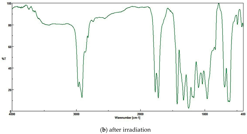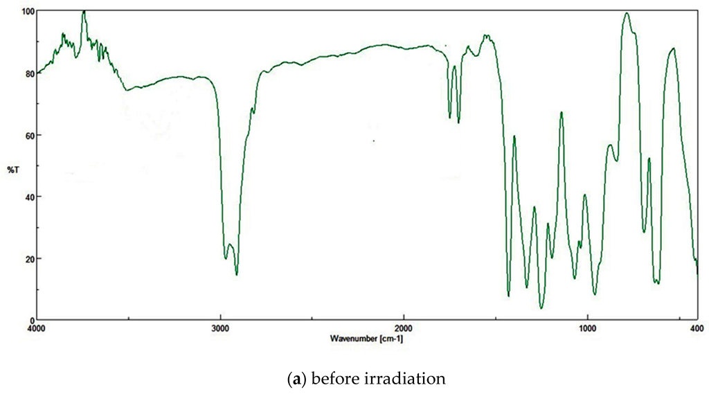 An FTIR 8300 Shimadzu Spectrophotometer (Shimadzu, Tokyo, Japan) was used to follow-up the progress of PVC polymeric films photodegradation within the 400–4000 cm−1 range. The carbonyl, polyene and hydroxyl groups’ absorptions took place at 1724, 1631 and 3400 cm−1, respectively. The changes in carbonyl, polyene and hydroxyl absorption peaks indicated the photodegradation progress at various irradiation times. The comparison between the FTIR absorption peaks at 1724, 1631 and 3400 cm−1 and the reference peak (1328 cm−1) allows the calculation of carbonyl (Ico), polyene (Ipo) and hydroxyl (IOH) indices [25]. Such a method is known as the band index method, as presented in Equation (1).