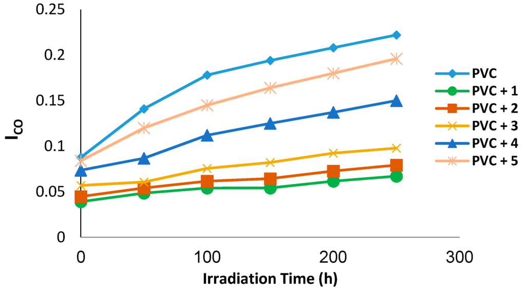 The relationship between the irradiation time (h) and carbonyl index (ICO) for PVC films (30 μm thickness) with Schiff’s bases 1–5 (0.5% by weight) as additives.