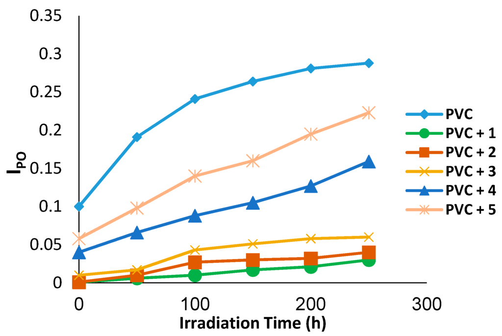 The relationship between the irradiation time (h) and polyene index (IPO) for PVC films (30 μm thickness) with Schiff’s bases 1–5 (0.5% by weight) as additives.