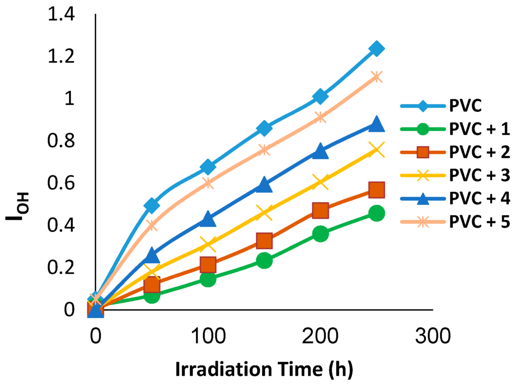 The relationship between the irradiation time (h) and hydroxyl index (IOH) for PVC films (30 μm thickness) with Schiff’s bases 1–5 (0.5% by weight) as additives.