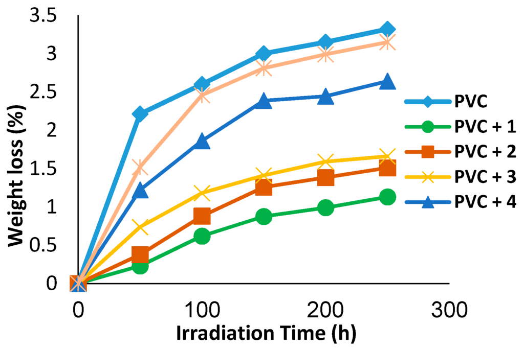 The calculation of weight loss percentage of the photodegraded PVC films in the presence and absence of Schiff’s base additives allows the determination of the stabilizing effectiveness, as shown in Equation (2) [26].