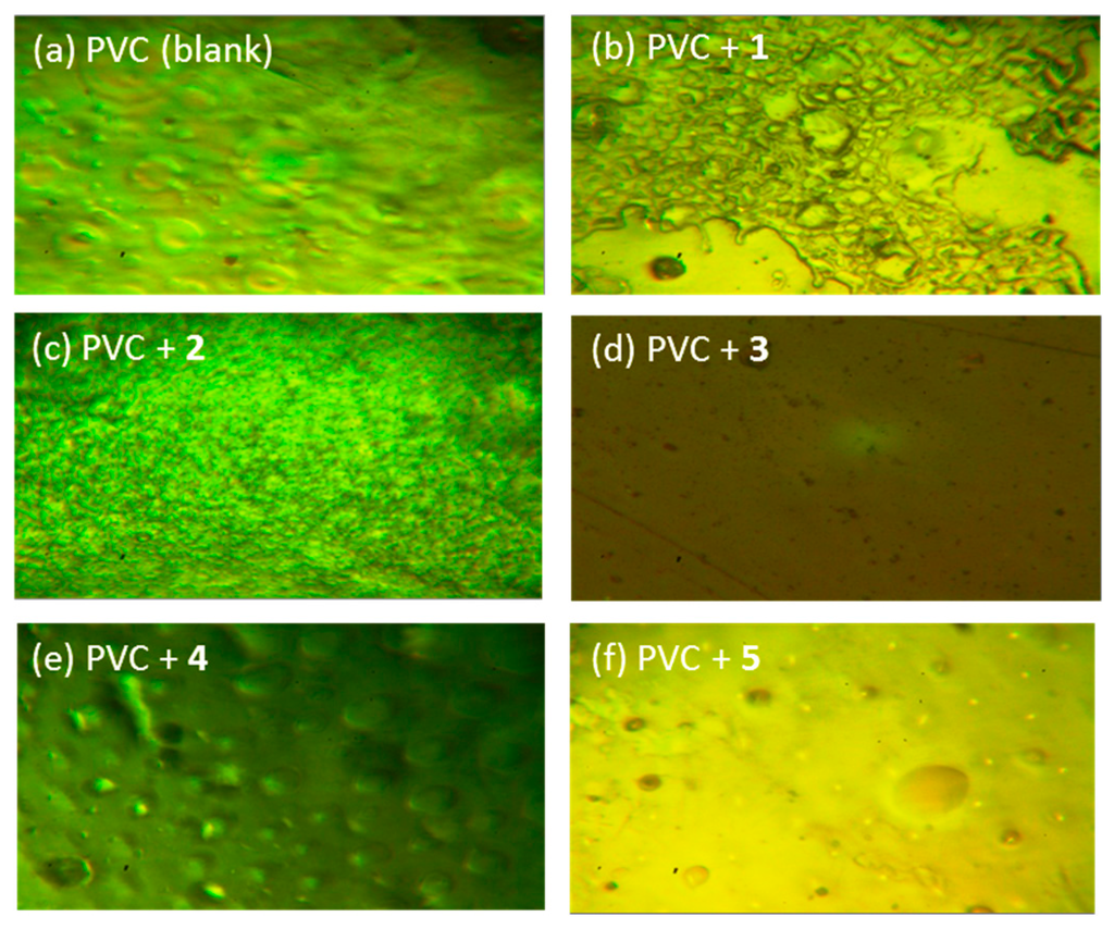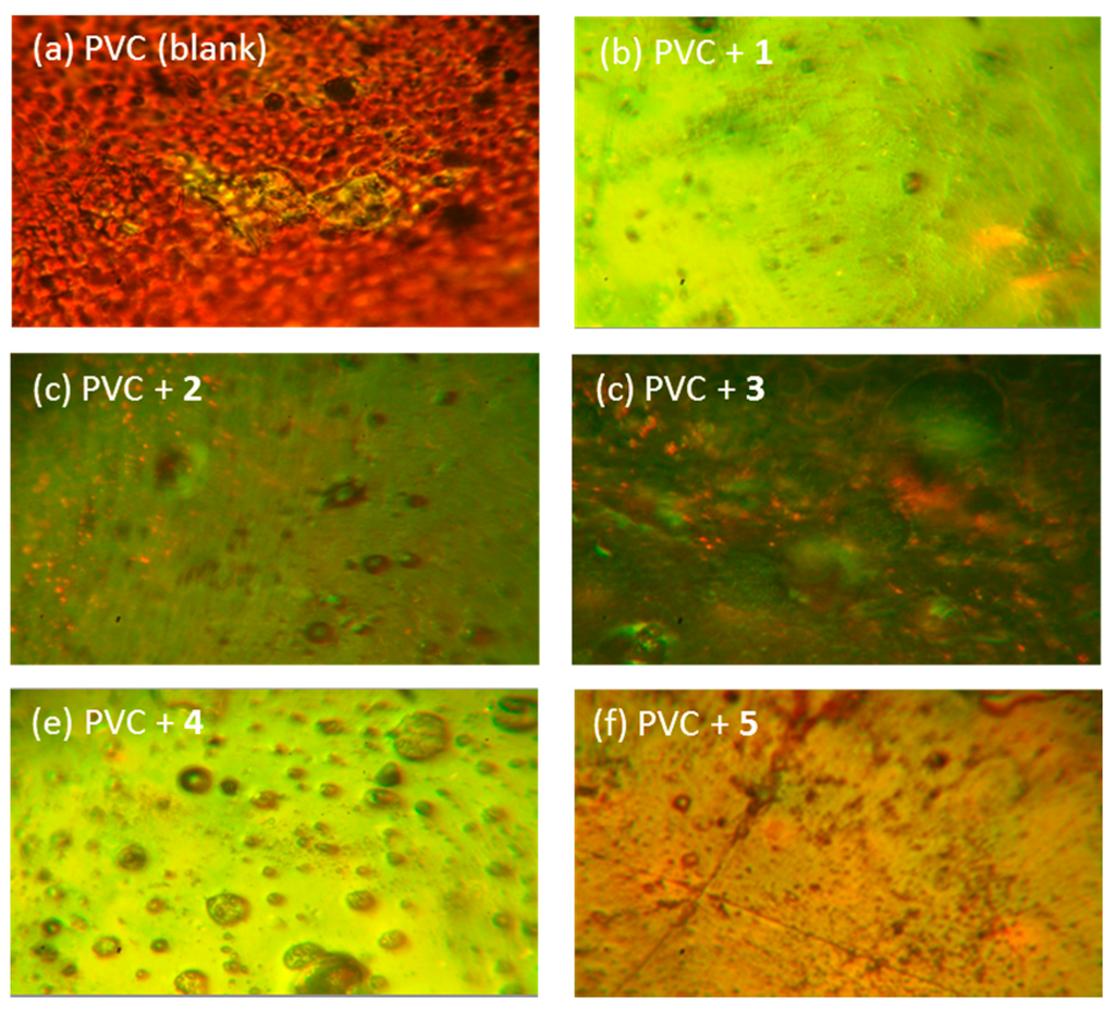 Microscope images for the non-irradiated PVC films (30 μm thickness) with Schiff’s bases 1–5 (0.5% by weight) as additives.