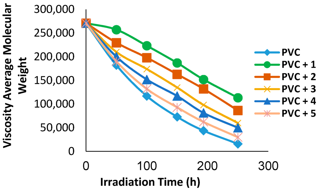 The relationship between the irradiation time (h) and viscosity average molecular weight for PVC films (30 μm thickness) with Schiff’s bases 1–5 (0.5% by weight) as additives.