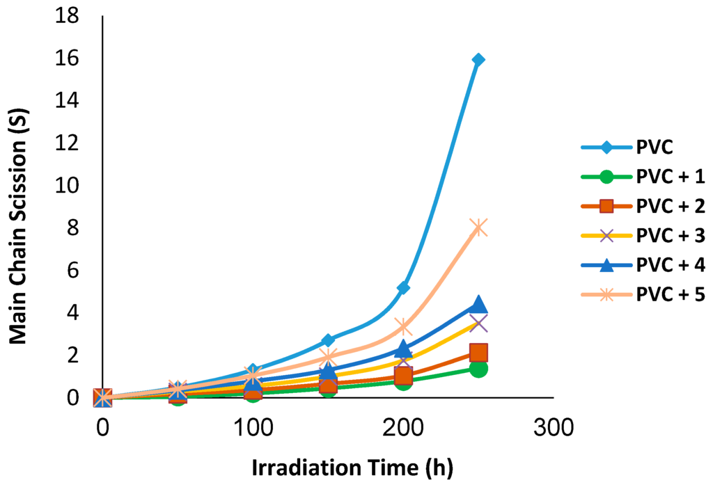 The relationship between the irradiation time (h) and main chain scission (S) for PVC films (30 µm thickness) with Schiff’s bases 1–5 (0.5% by weight) as additives.