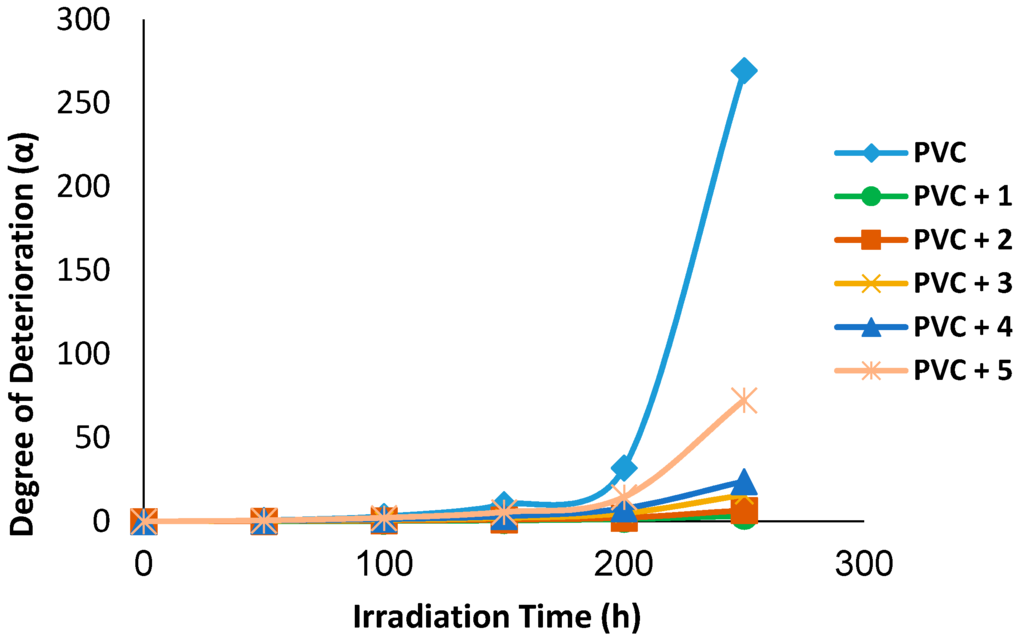 where m = the initial molecular weight. Figure 11 shows the relationship between the irradiation time and degree of deterioration (α). Clearly, the α values for the irradiated PVC samples with Schiff’s base additives were lower compared to the case where no additive (blank) was used. The α values were found to be increased rapidly with irradiation time in the initial stages of photodegradation of PVC films, which could be due to a random polymeric chain bonds breaking.