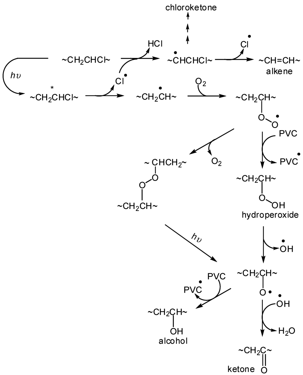 - Gardette, J.L.; Gaumet, S.; Lemaire, J. Photooxidation of poly(viny1 chloride). 1. A reexamination of the mechanism. Macromolecules 1989, 22, 2576–2581. [Google Scholar] [CrossRef]