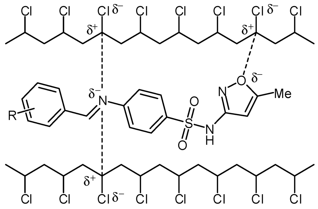 The interaction between the PVC polymeric chains and Schiff’s base additives has been suggested to be dependent on the coordination between the heteroatoms within Schiff’s bases, and, in particular, the nitrogen of imine bonds, and the polarized carbon-chlorine bonds within the PVC polymeric chains [16]. It is believed that strong interactions between PVC polymeric chains and Schiff’s bases could lead to an effective energy transfer. Therefore, the attraction between PVC chains and Schiff’s bases 1–5, as a result of the polarities of oxygen atoms within isoxazole ring, nitrogen of imine bonds and PVC carbon-chlorine bonds has been suggested to stabilize the polymeric materials through dissipation of the energy from the PVC excited state by energy transfer (Scheme 3). However, there is no experimental evidence to support such speculation.
