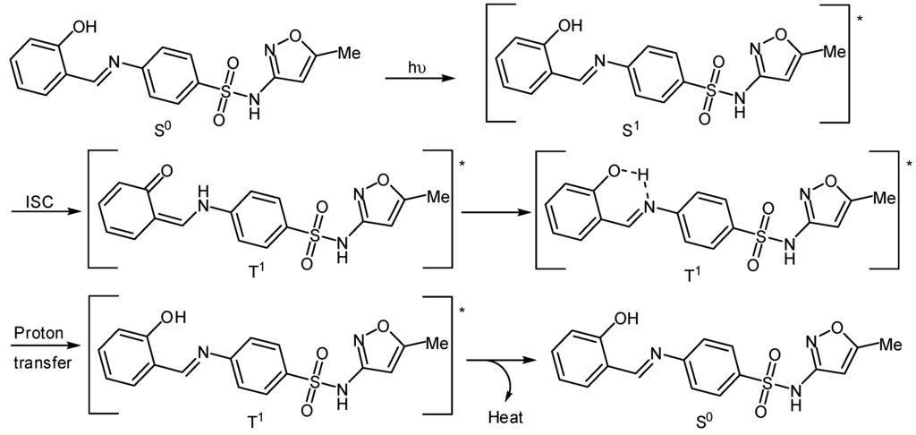 Since the performance of Schiff’s bases tested is different, it is likely that the nature of substitution on the phenyl ring had an effect on the level of PVC films’ stabilization. Compound 1 was found to be the most effective additive towards stabilization of the PVC films. Such effect could be due to the presence of hydroxyl groups on the phenyl ring attached to the imine bond. It was reported that the stabilization of PVC films in the presence of Schiff’ base compounds could be explained through a proton transfer for the singlet excited state (S1) of the additive followed by internal conversion (IC), proton transfer and then dissipation of energy as a heat [42]. In addition, it was reported that stabilization of PVC can take place through intersystem conversion (ISC) of the S1 state of the additive to the triplet excited state (T1) followed by a proton transfer and then conversion to the ground state (S0) in which energy was dissipated as heat [42]. Therefore, photostabilization of PVC films through a proton transfer and intersystem crossing (ISC) in the presence of Schiff’s base 1 was suggested in Scheme 4.