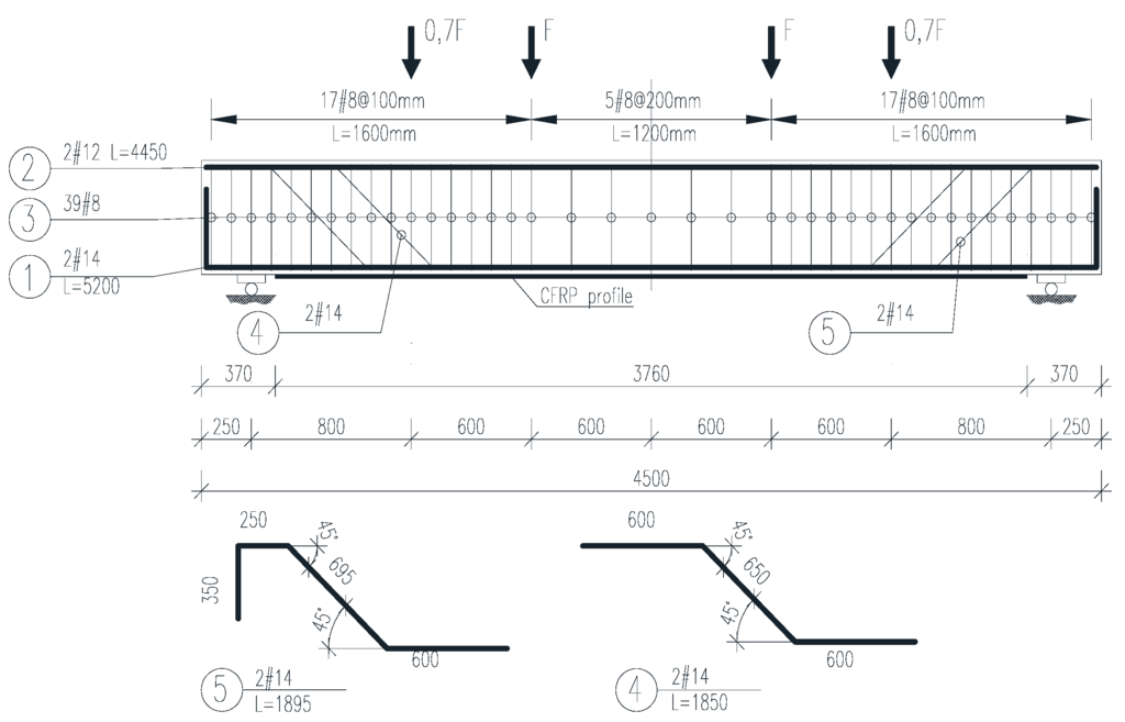 The beams were reinforced with two 14 mm diameter steel bars (reinforcement ratio ρs = 0.22%) in tension and two 12 mm diameter steel bars in compression. Vertical reinforcement consisting of 8 mm bars at 100 mm spacing in each shear span and at 200 mm spacing in the middle 1200 mm constant moment region were provided. Bent 14 mm bars were used as additional shear reinforcement in the support regions to prevent shear failure (Figure 1).