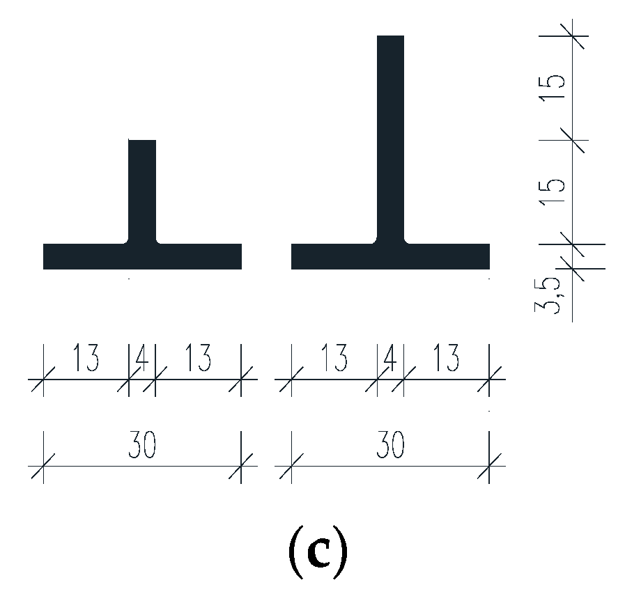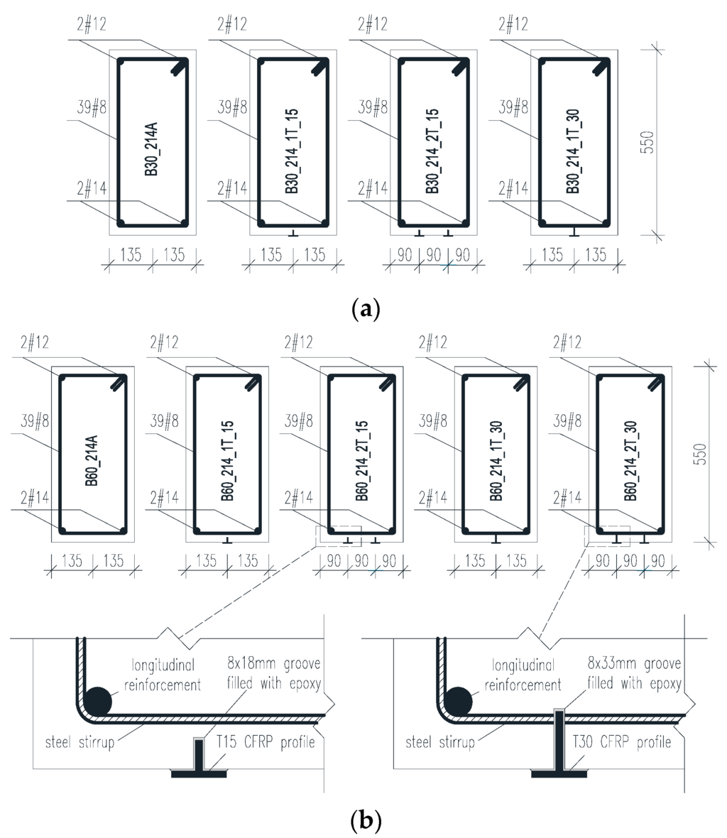 Beams were cast in two series using different concrete mixtures (B30 and B60). One reference beam in each series was left un-strengthened as indicated by the symbol “A” (B30-214A and B60-214A). The remaining beams were strengthened using different configurations of the CFRP profiles (Figure 2a,b). Each beam designation (Figure 2, Table 1) indicates: concrete strength (B30 for concrete C30/37 and B60 for C50/60 class); “214” for two 14 mm tensile reinforcing bars; and the CFRP T-shaped reinforcement. For example, beam B30-214-2T-30 identifies the beam as made of class C30/37 concrete, reinforced with two 14 mm diameter bars and strengthened with two T-shaped CFRP profiles having 30 mm web heights. The embedment length of all CFRP profiles was equal to 3760 mm (Figure 1).