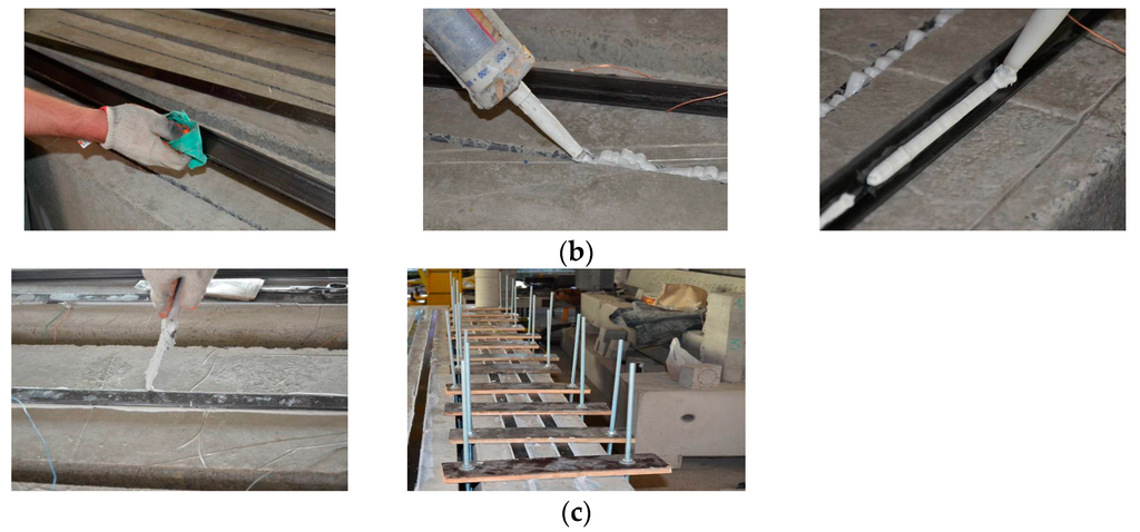 Strengthening procedure: (a) dimensions of the grooves and cutting procedure; (b) preparing the profile surfaces and gluing; (c) removing the epoxy and curing.