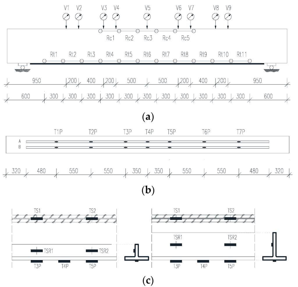 Vertical deflections were measured using nine vertically-oriented 50 mm-stroke LVDTs (V1–V9), placed along the span of the beam, as shown in Figure 4a. Concrete strain at the level of the longitudinal steel reinforcement was measured using five 10 mm LVDTs placed in compression (Rc1–Rc5) and eleven 20 mm LVDTs tension (Rt1–Rt11). Strains in the CFRP profiles were recorded using seven electrical resistance strain gauges (T1p–T7p) placed along the flange of each profile (see Figure 4b). Two additional strain gauges (Tsr1–Tsr2) were applied on the web of the CFRP profile (Figure 4c).