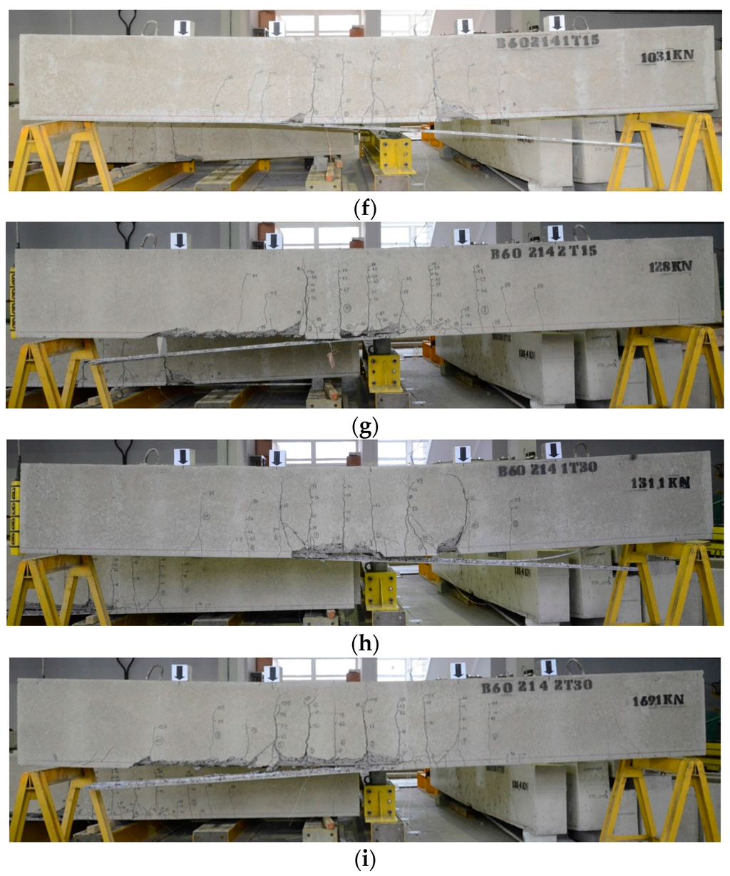 Failure modes of tested beams: (a–i) corresponding to beams No. (1–9, Table 1).