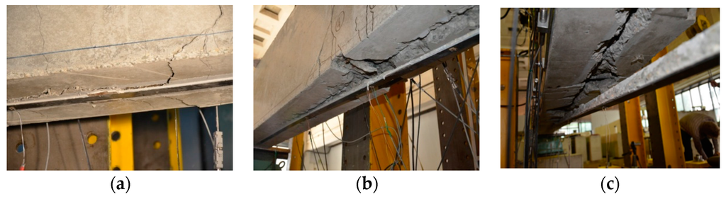 Reference beams (B30-214-A and B60-214-A) failed in a ductile flexural mode typical of under-reinforced steel-RC structures. The failure featured yielding of the tensile steel reinforcement (SY), which is seen as a progressive increase in the mid-span deflection and a small increase in the applied load, which is discussed in Section 3.3. After the steel yielding and progressive increase in midspan deflection of beam B60-214-A, the applied load was stopped when the mid-span LVDT exceeded its range of 50 mm. In order to obtain higher deflections in beam B30-214-A, a longer 200 mm LVDT was used. When the midspan deflection reached 104 mm, the concrete in compression, close to the internal loading point started crushing (see Figure 5a) and the beam was immediately unloaded (see Section 3.3). It is worth noting, that these crucial points in the reference beam tests were identified as the ultimate loads and corresponding maximum mid-span deflections. It is expected that the B60 beam would have continued to a maximum deflection only slightly less than the B30 beam.