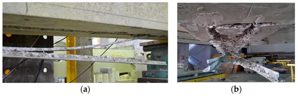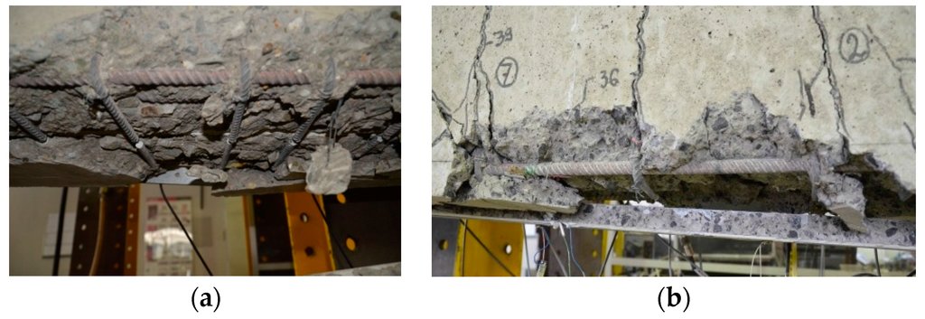 One of the strengthened beams (B60-214-1T-15) partially failed by intermediate crack debonding (ICD) and pure interfacial bond failure between the CFRP profile and adhesive (BPA). This failure was caused by a poor adhesion between the smooth CFRP profile and adhesive. In the beams strengthened with the 15 mm deep profiles, a detached concrete cover consisted of a concrete triangular prism with the CFRP profile inside (see Figure 6).