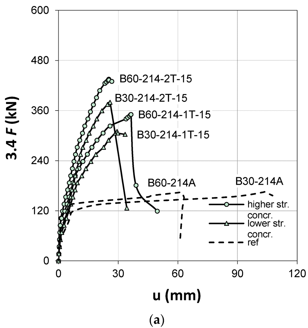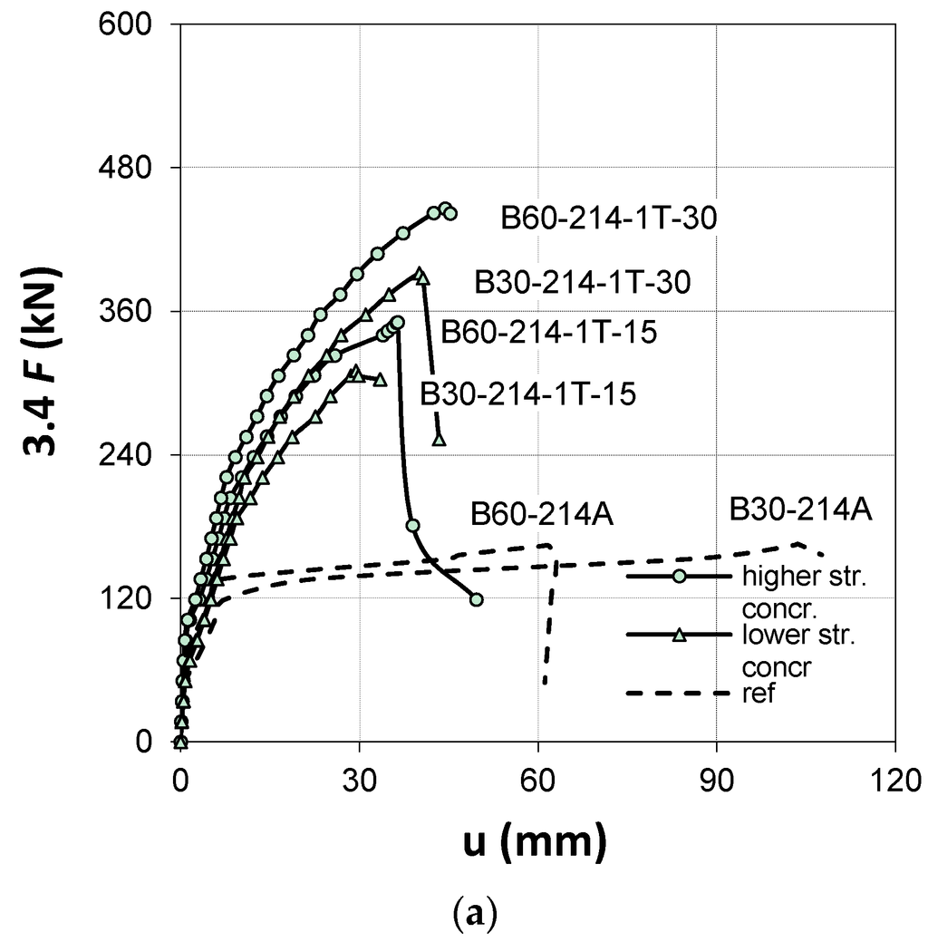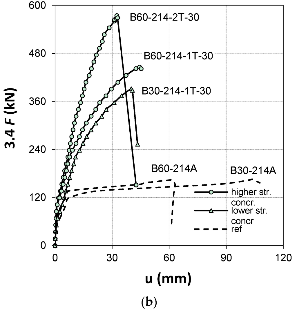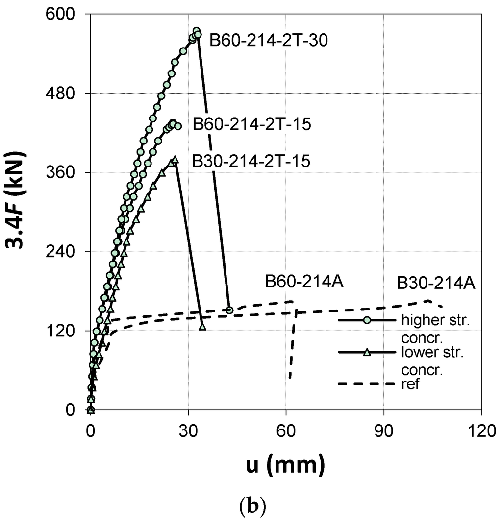 A comparative analysis of the vertical mid-span displacement depends mainly on the influence of the concrete strength, number of profiles, and their height. The results of all beams confirmed a significant reduction of between 67%–83% and 30%–60%, for B30 and B60 series, respectively, in mid-span deflection following strengthening. The concrete strength had an effect on the stiffness of the beams (compare B30-214-1T-15 and B60-214-1T-15), which, as expected, was greater for the beams made of higher concrete strength.