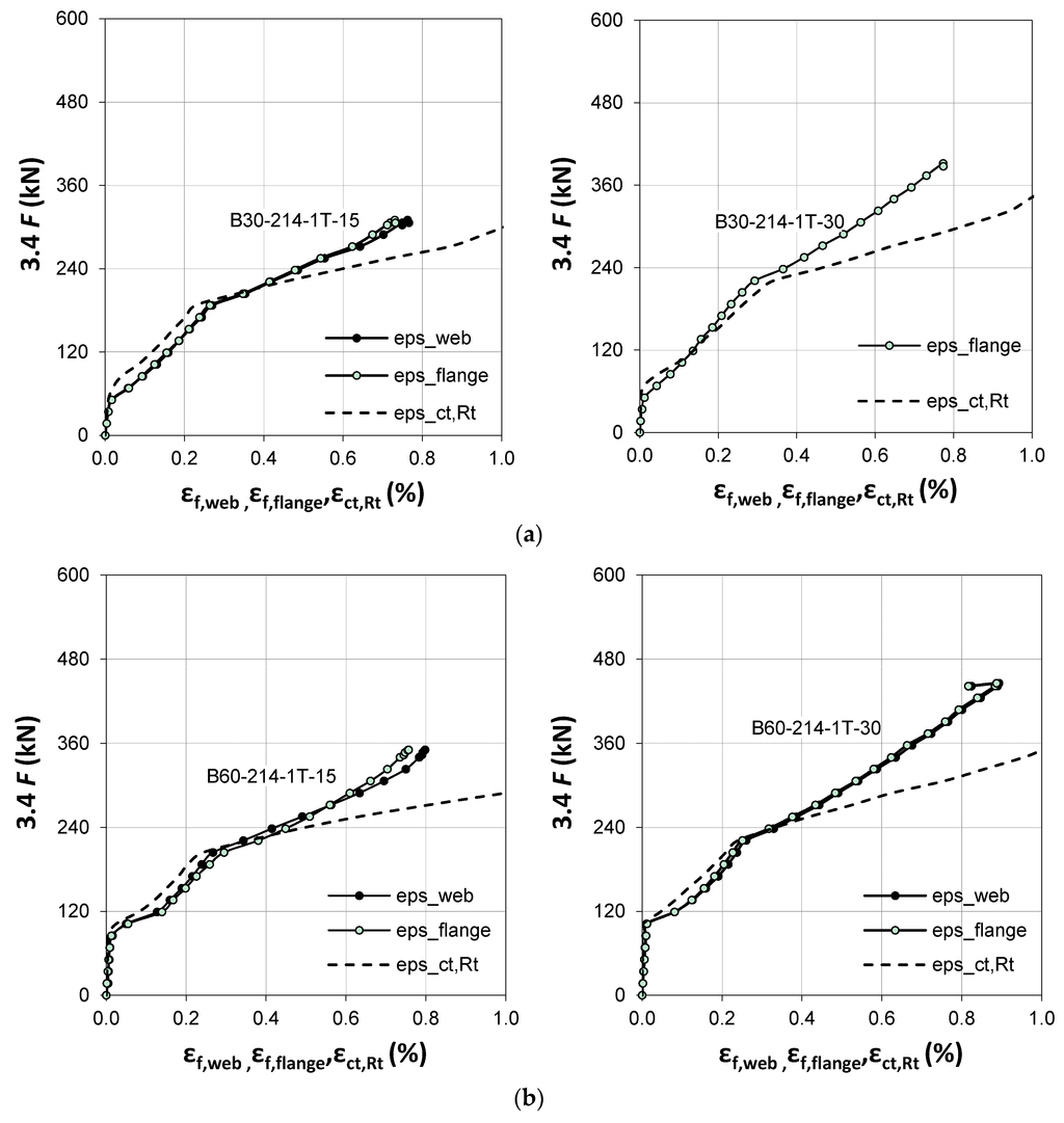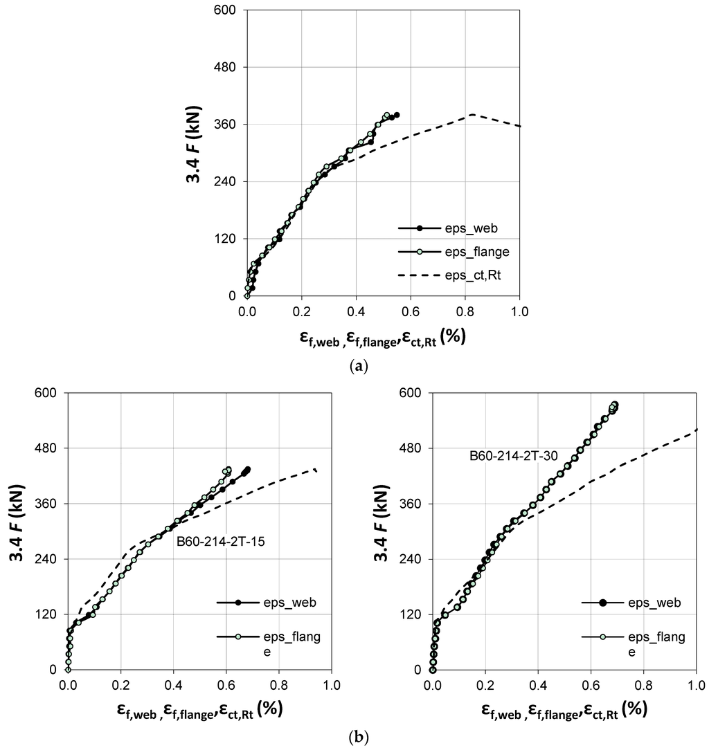Figure 11 and Figure 12 show the strains measured on the web and flange of the CFRP profile (averaged from two characteristic locations: T3P and T5P on the flange and TSR1 and TSR2 on the web). A similar strain distribution and history is seen in each beam.