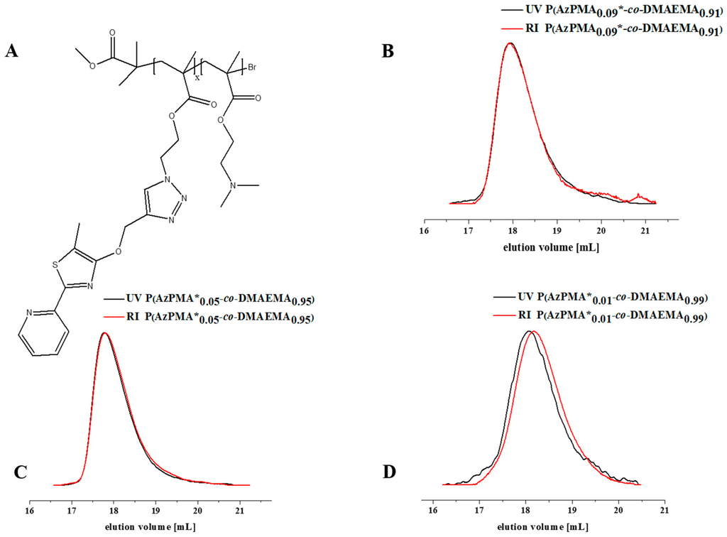 (A) Schematic representation of a dye functionalized copolymer; comparison of SEC traces for P(AzPMA*x-co-DMAEMAy) (A) with different ratios of AzPMA; (B) P(AzPMA*0.09-co-DMAEMA0.91), (C) P(AzPMA*0.05-co-DMAEMA0.95); (D) P(AzPMA*0.01-co-DMAEMA0.99) investigated using RI (black trace) and UV/VIS detector (red trace); eluent: N,N-Dimethylacetamide with 2.1 g·L−1 LiCl, detector wavelength: 360 nm.