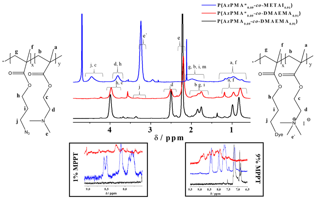 Comparison of 1H NMR spectra for P(AzPMA0.09-co-DMAEMA0.91) (black line, CDCl3), P(AzPMA*0.09-co-DMAEMA0.91) (red line, CD2Cl2), P(AzPMA*0.09-co-METAI0.91) (blue line, D2O); the two insets show the aromatic regions of the copolymers containing 1% and 9% MPPT, respectively.