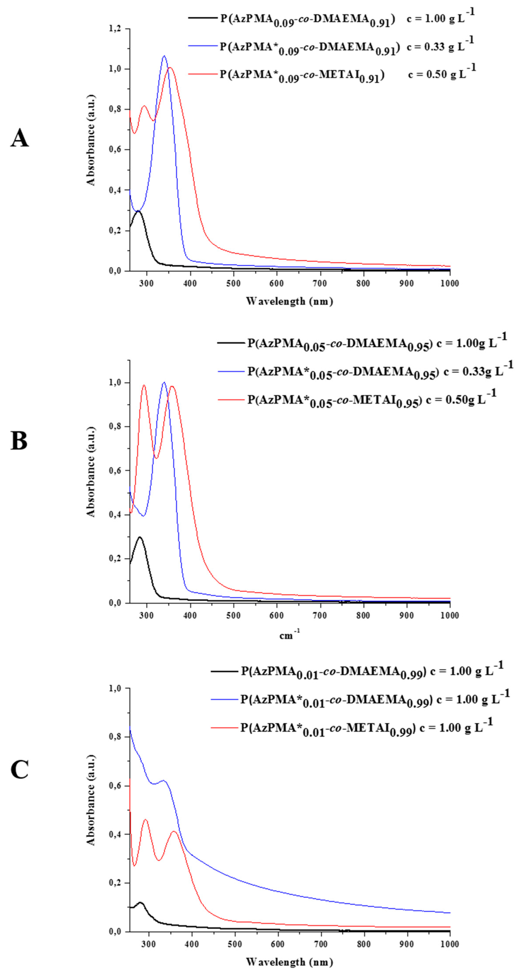 Comparison of UV/VIS spectra for (A) P(AzPMA0.09-co-DMAEMA0.91) (black curve), P(AzPMA*0.09-co-DMAEMA0.91) (blue curve) and P(AzPMA*0.09-co-METAI0.91) (red curve); (B) P(AzPMA0.05-co-DMAEMA0.95) (black curve), P(AzPMA*0.05-co-DMAEMA0.95) (blue curve) and P(AzPMA*0.05-co-METAI0.95) (red curve); (C) P(AzPMA0.01-co-DMAEMA0.99) (black curve), P(AzPMA*0.01-co-DMAEMA0.99) (blue curve) and P(AzPMA*0.01-co-METAI0.99) (red curve, all spectra recorded in water).