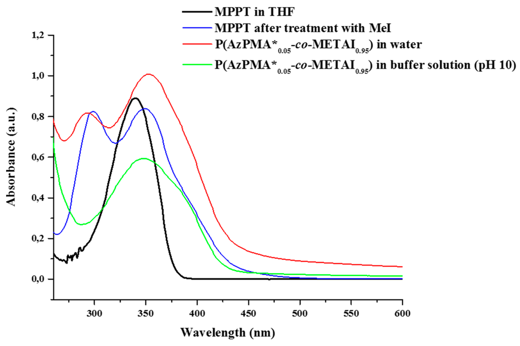 To investigate whether MPPT itself is affected by the quaternization reaction, we also subjected the pristine dye to comparable reaction conditions and compared the resulting UV/VIS spectra (Figure 4, Table 3) with those of P(AzPMA*0.09-co-DMAEMA0.91) under both neutral conditions and at pH 10 (the conditions where interpolyelectrolyte complex formation will take place later on). Due to its rather low solubility in aqueous media, UV/VIS spectra of MPPT were measured in THF both before and after quaternization. After quaternization, MPPT displays absorption bands at 299 nm and 349 nm, comparable to the absorption spectra obtained for the labeled copolymers after methylation. Nevertheless, no indication of a successful quaternization of MPPT could be observed by 1H NMR, and therefore we attribute the appearance of a second UV/VIS band to remaining I3−. Surprisingly, at pH 10 the first absorption band for the copolymer vanishes and only the absorption at 349 nm can be observed. Further, the absorption band for MPPT broadens and decreases in intensity, which we at this point attribute to the used borate buffer. Further, also the triazole ring will be quaternized under these conditions, but the stability of this moiety after quaternization was previously confirmed by Mishra et al. by NMR studies [56].