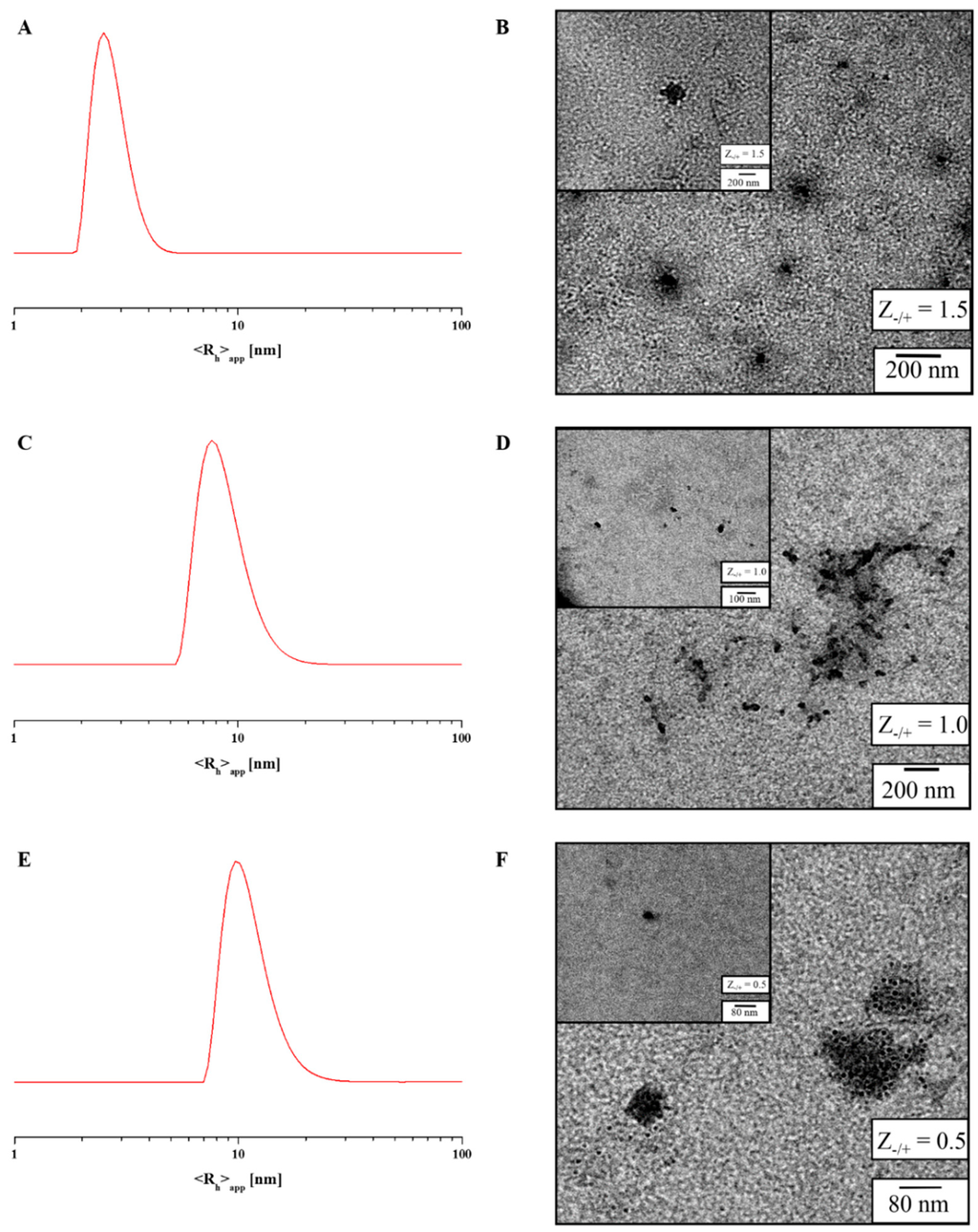 Number-weighted DLS CONTIN plots and TEM micrographs for micellar IPECs formed at Z−/+ = 1.5 (A,B); Z−/+ = 1.0 (C,D); and Z−/+ = 0.5 (E,F).