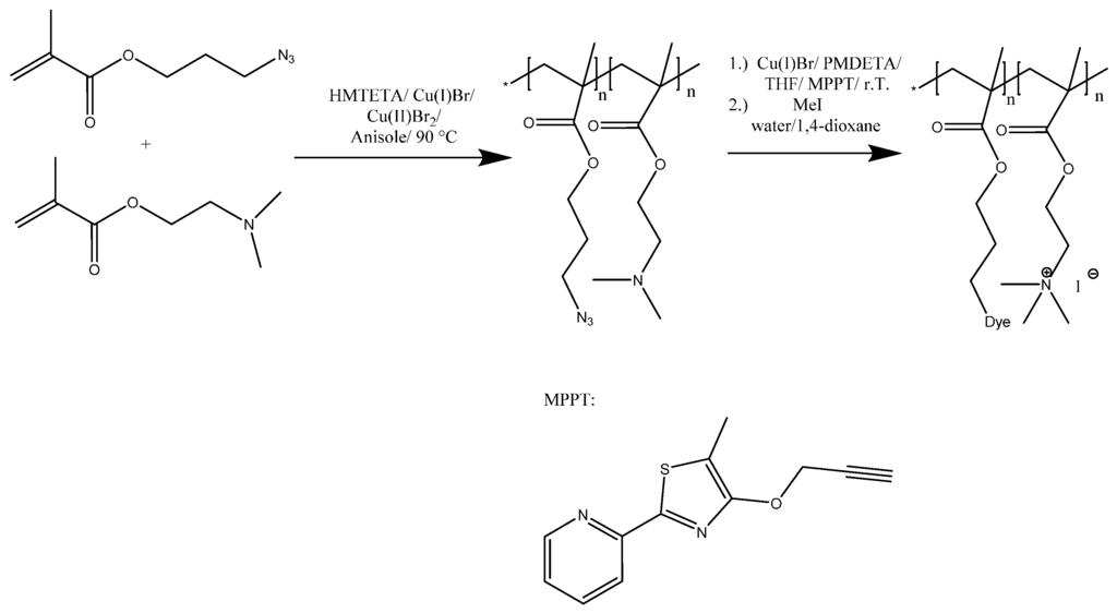We presented the synthesis and characterization of P(AzPMA*y-co-METAIx) copolymers of different composition using ATRP of AzPMA/DMAEMA mixtures, followed by covalent attachment of a thiazole-based dye (MPPT) via CuAAC chemistry and quaternization. Hereby, dye contents of up to 9% could be reached and the labeled copolymers were investigated using a combination of NMR and UV/VIS spectroscopy.