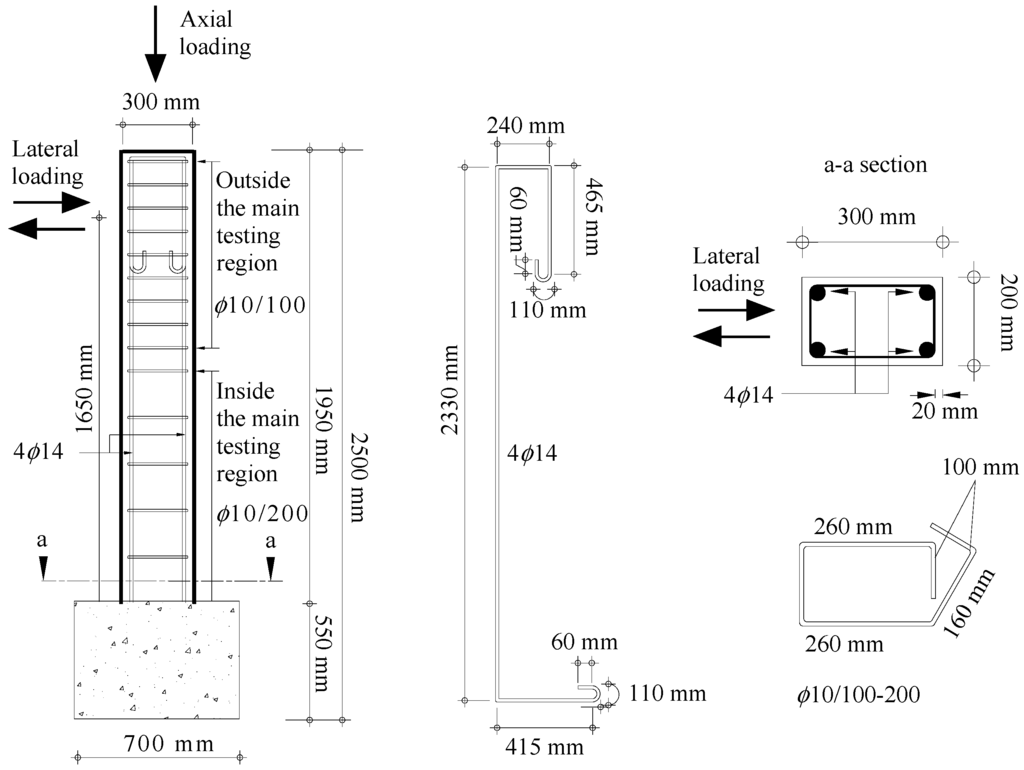 The geometry and the reinforcement details of the columns are presented in Figure 2. In this figure, it can be observed that the longitudinal bars were (4ϕ14) continuous from the bottom of the footing to the top of the column. The spacing of transverse bars was 200 mm in the testing zone (ϕ10/200). All internal reinforcing bars were plain round bars, which had been used commonly until 2000s in Turkey.