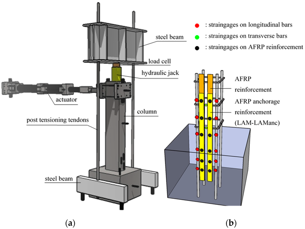 (a) The testing setup; and (b) Strain gauges on steel bars and AFRP reinforcement.