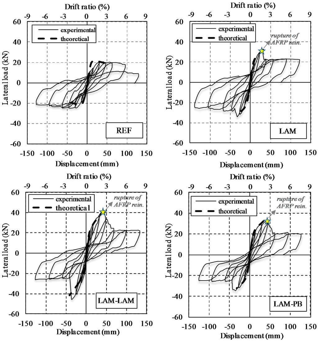 Experimental and theoretical lateral load–displacement curves for all specimens (rein., reinforcement).