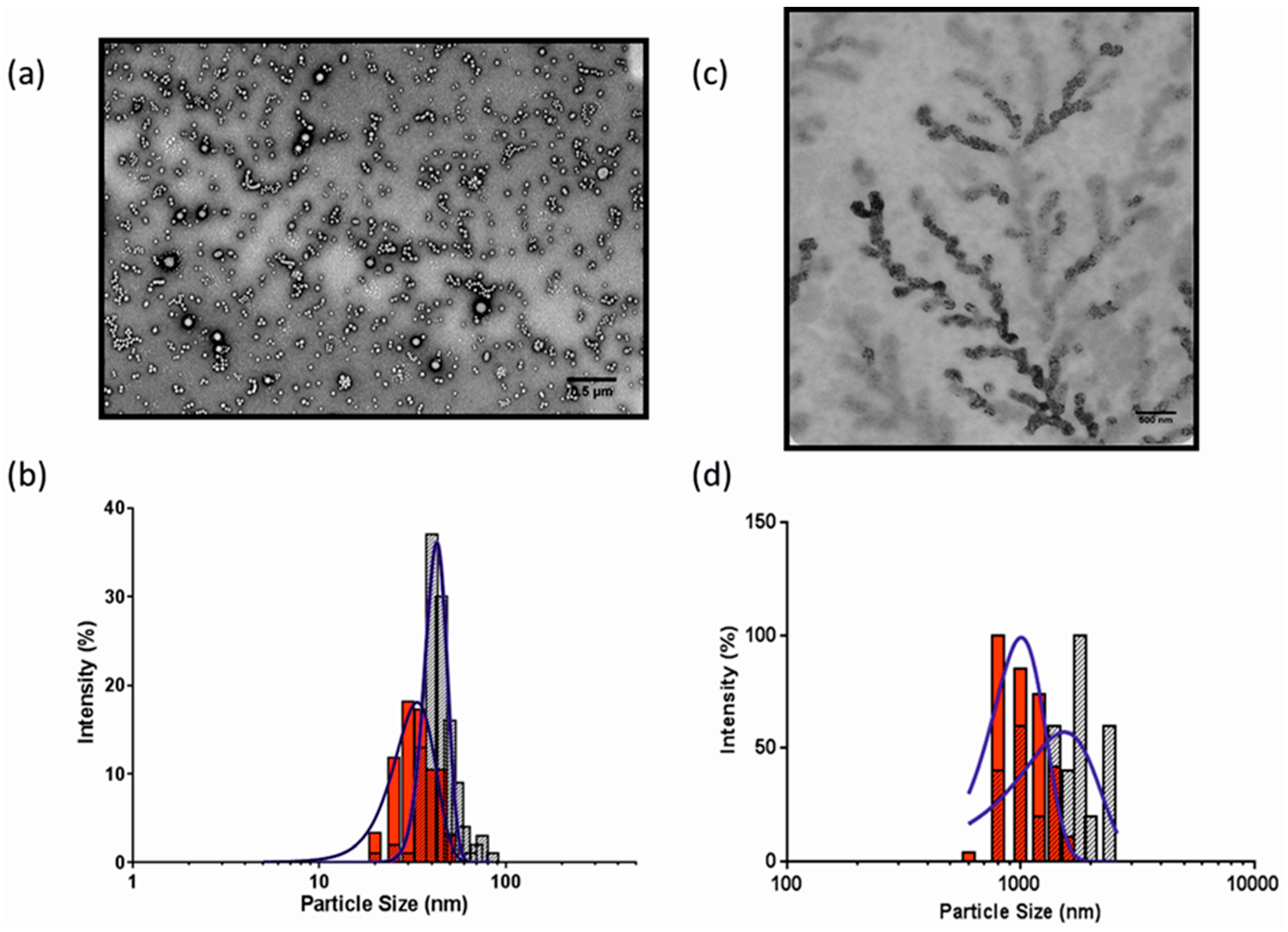 (a)Transmission electron microscopy (TEM) of poly(2-methyloxazoline)–poly(dimethylsiloxane)–poly(2-methyloxazoline) (PMOXA–PDMS–PMOXA) polymersome sample produced via the adapted slow aqueous addition method; (b) comparison of TEM (Grey bars) grainsizing and Dynamic Light Scattering (DLS) (Red bars) sizing data show an average size of 45 nm compared to 32 nm, respectively, and a polydispersity index of 0.5; (c) TEM of PMOXA–PDMS–PMOXA polymersomes produced via the previously published method with excess ethanol (excess ethanol method) [26] shows the presence of polymer networks and (d) the corresponding TEM (Grey bars) and DLS (Red Bars) grainsizing showing an average size of 1.8 µm and 800 nm respectively.