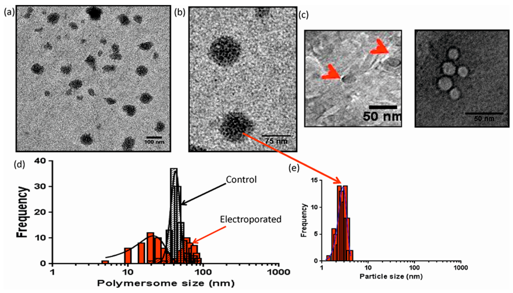 Polymersomes (before and after electroporation) were imaged using a FEI Tecnai G2 Spirit transmission electron microscope. Before imaging, 5 µL of the polymersome sample was spotted on to carbon coated copper EM grids. After incubation for approximately 2 min, excess sample was blotted off using filter paper, and the grids dried under vacuum. For non-electroporated polymersome samples, a 0.75% uranyl formate stain (to enhance polymersome contrast) was applied for 15 s, before again blotting and drying under vacuum. Images were recorded using a Gatan 4000 × 4000 resolution charge coupled device (CCD) camera (Gatan, Pleasanton, CA, USA ), and processed using both Gatan micrograph and ImageJ software (National Institute of Health, Bethesda, MD, USA). Cryo-electron microscopy was performed on holey carbon grids prepared using 5 μL of polymersome sample. The grids were subsequently blotted for 3 s (at 100% humidity) and plunged into liquid ethane using a Vitrobot mark III. Samples were visualised on a Philips CM200, fitted with a Gatan 4000 × 4000 resolution CCD camera. All data were collected in low dose mode.