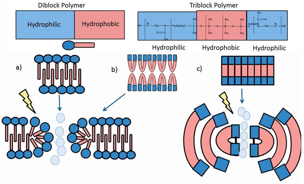 It has previously been proposed by both Lomora [50] and Itel [52] that when forming a membrane that tri-block polymers could completely double over on itself, in a configuration analogous to a “hairpin”, which would render them equivalent to a di-block or lipid, thus assembling to form a membrane equivalent to a lipid bilayer (as shown by Figure 3b). However, in our polymer block proportions are 1700:4000:1700 g·mol−1, meaning the hydrophobic block length is more than double the hydrophilic block lengths. Therefore, further analysis (e.g., using computational modelling) would be necessary to determine if it is possible for the PMOXA–PDMS–PMOXA used in this study, to form a hairpin and behave analogous to a di-block membrane. Our hypothesis is that the membrane consists of one unit; a single polymer as opposed to two polymers forming a bilayer. This means that head group rearrangement to form a pore may be restricted (Figure 3). We propose a mechanism for rearrangement during electroporation, based on this property of PMOXA–PDMS–PMOXA. We suggest that, due to the flexibility within the tri-block polymer membrane, the introduction of polar water molecules into the membrane via electroporation causes the polymer to bend over on itself to shield the hydrophobic region of its structure (Figure 3c). This comes from both the length of the membrane and its high flexibility.
