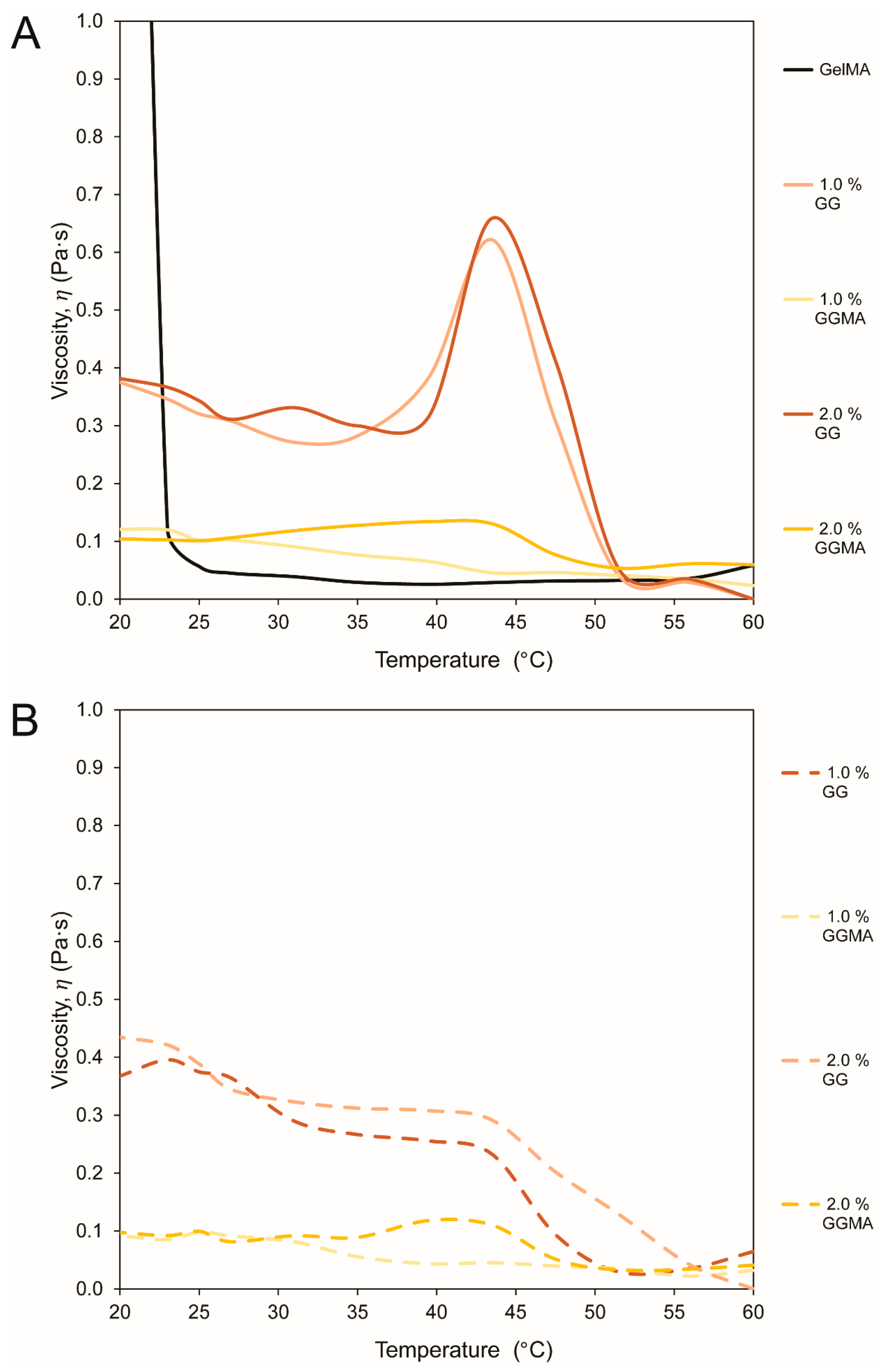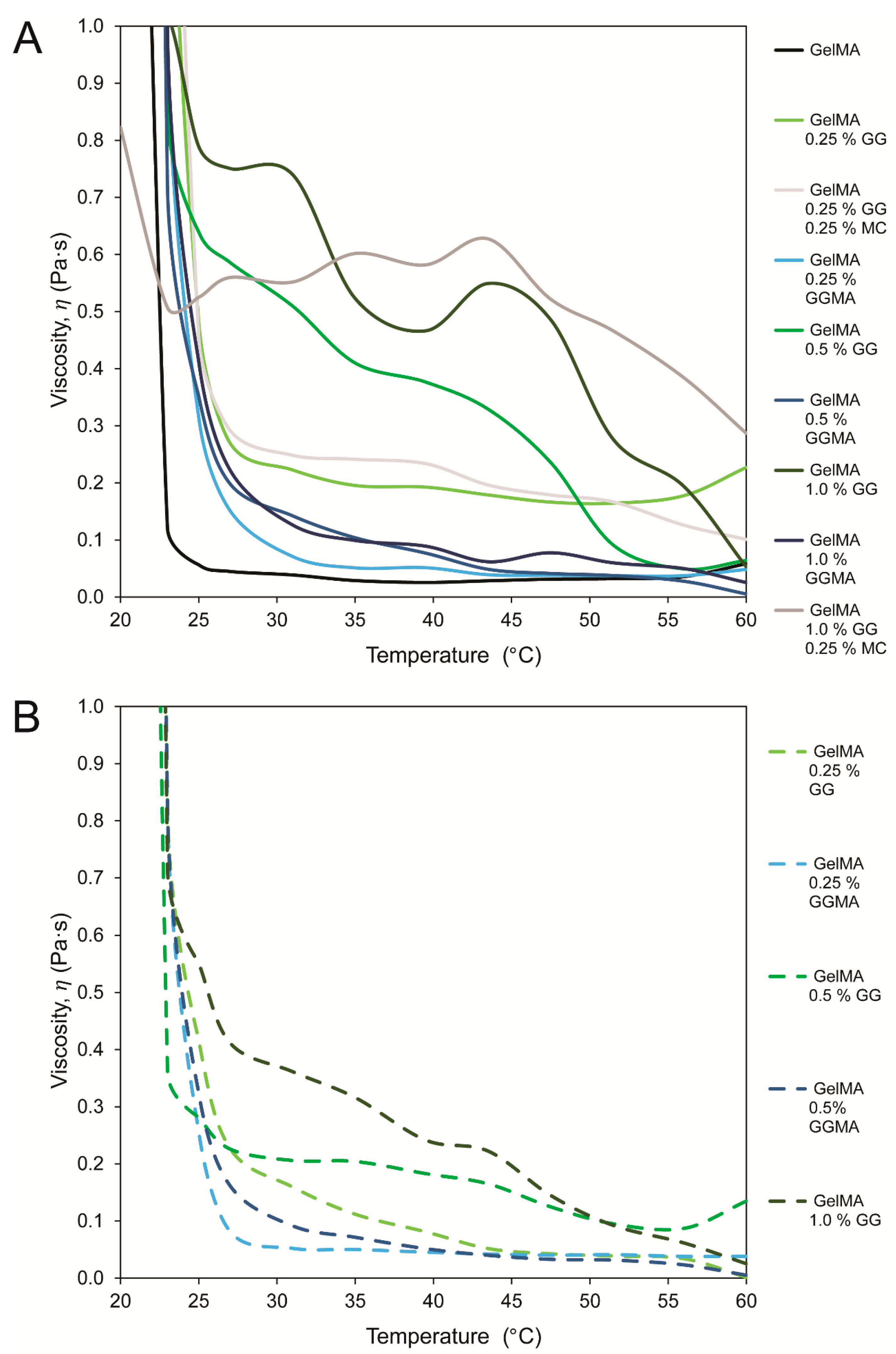 across the temperature sweep. Firstly, the rheometer was set up with the 1° cone in cone and plate configuration, and the idle temperature was set to 60 °C to avoid gelation prior to testing. Hydrogel blends were made, and 500 µL of premixed, preheated hydrogel solution was pipetted onto the rheometer platform. The chamber was closed and a constant shear rate (
