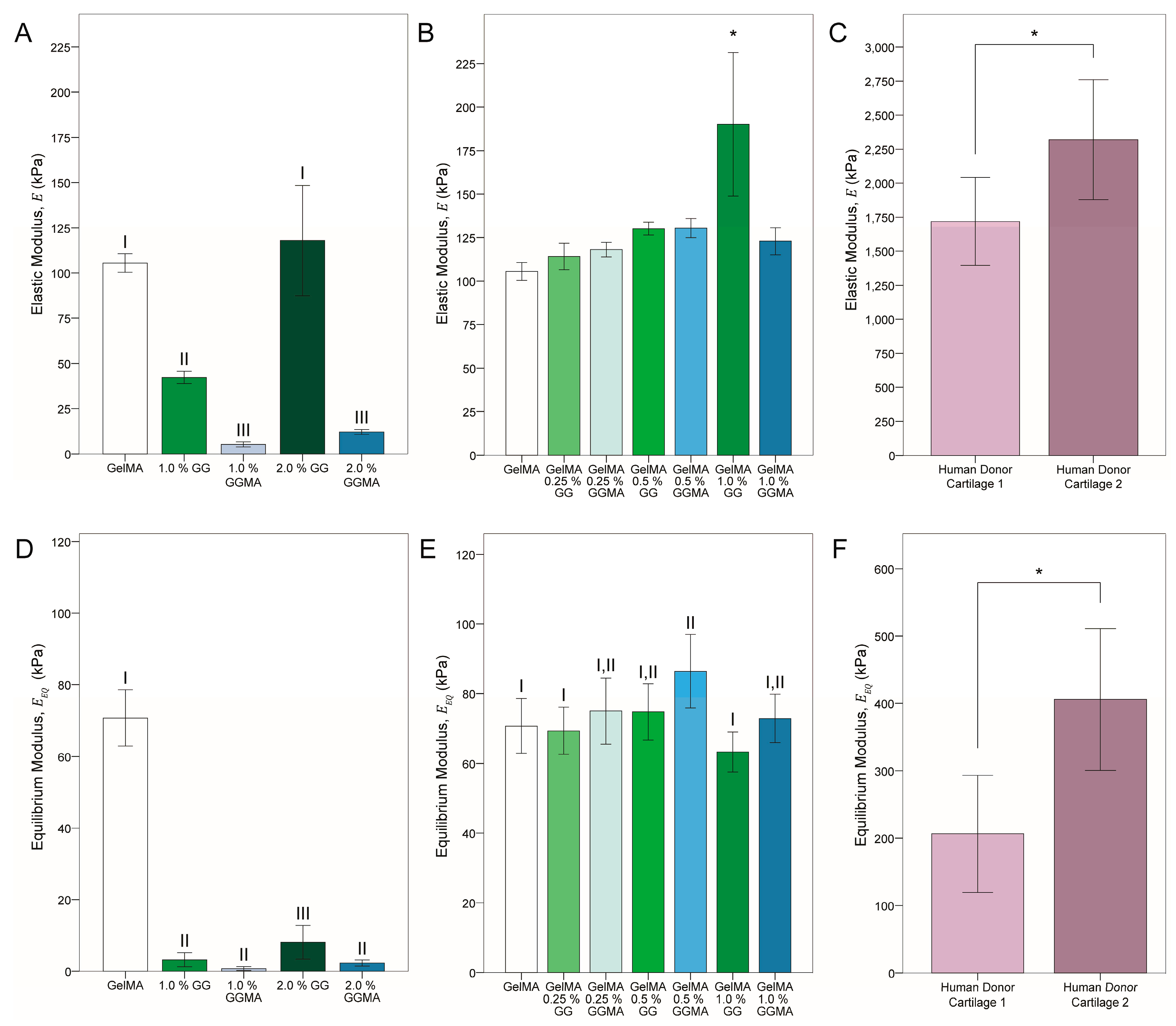 In contrast, photocrosslinking of GGMA in a low-ion solution caused the network to become locked in place and reinfusion of ions was not able to recover modulus through network rearrangement—if recovery was possible at all, due to the modification of hydroxyl groups and hence removal of potential negative charge from deprotonation. Notably however, addition of GGMA to the GelMA did increase the modulus to a greater extent than the sum of individual moduli, with all concentrations giving a ~25% increase, similar to lower concentration GG-blended groups. Comparison with human articular cartilage donor tissues showed a dramatic 10-fold difference between hydrogels and native tissue. Variability was also found between donors, which will remain a considerable factor in the future design of tissue engineering structures, however values represented those found in literature for the elastic modulus of healthy elderly individuals (1–3 MPa) [