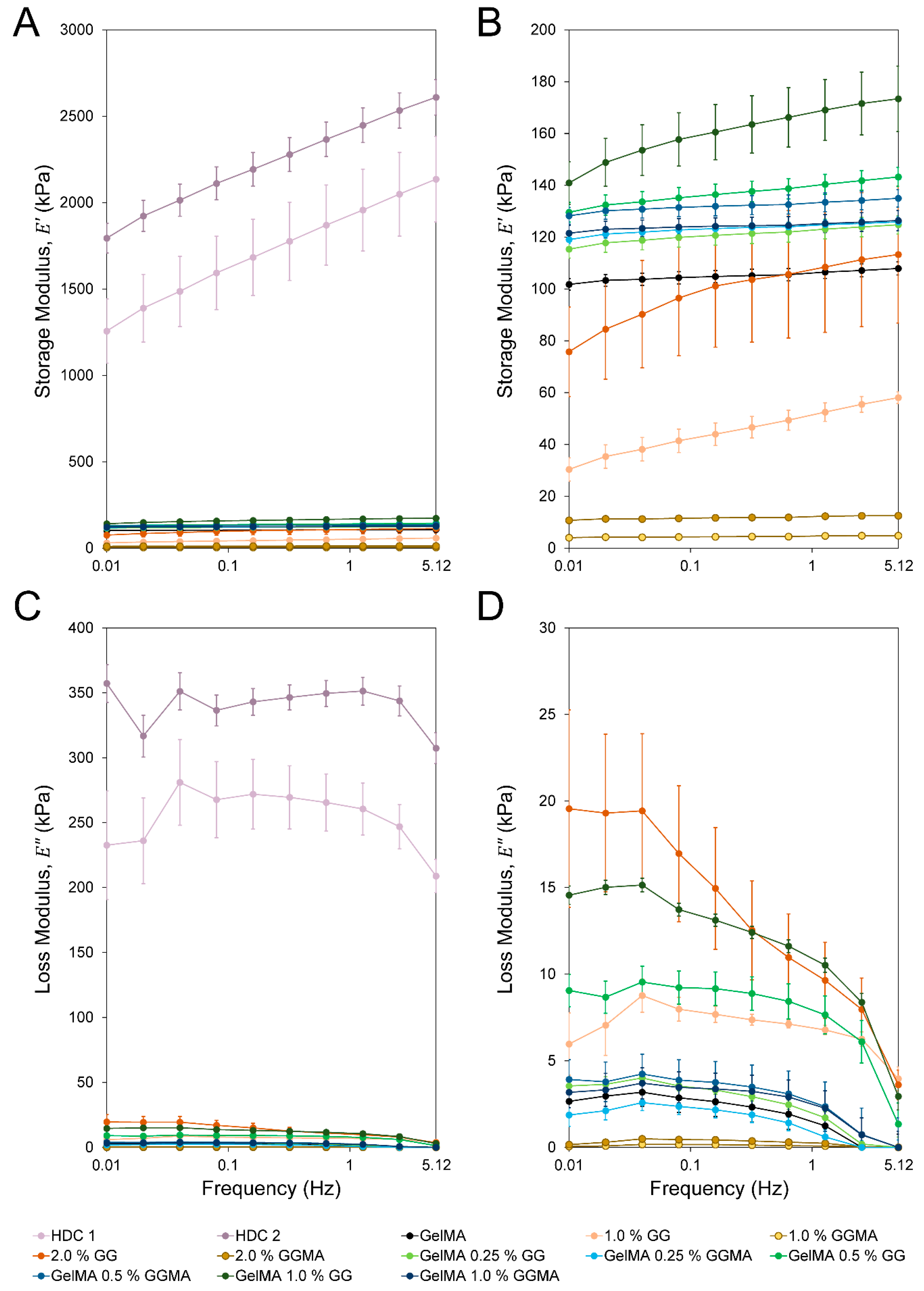 Figure 5A,C) where, across all frequencies, the donor explants maintained a relatively consistent loss modulus. As all hydrogels are subject to fluid flow through the matrix when compressed, some degree of hysteresis in loading must occur independent of which crosslinking modalities are used. Despite this, testing revealed that in the absence of ion-bound hydrogels such as GG, hydrogels exhibited a major frequency-dependent drop in loss modulus (e.g., GelMA, GelMA/GGMA, GGMA;