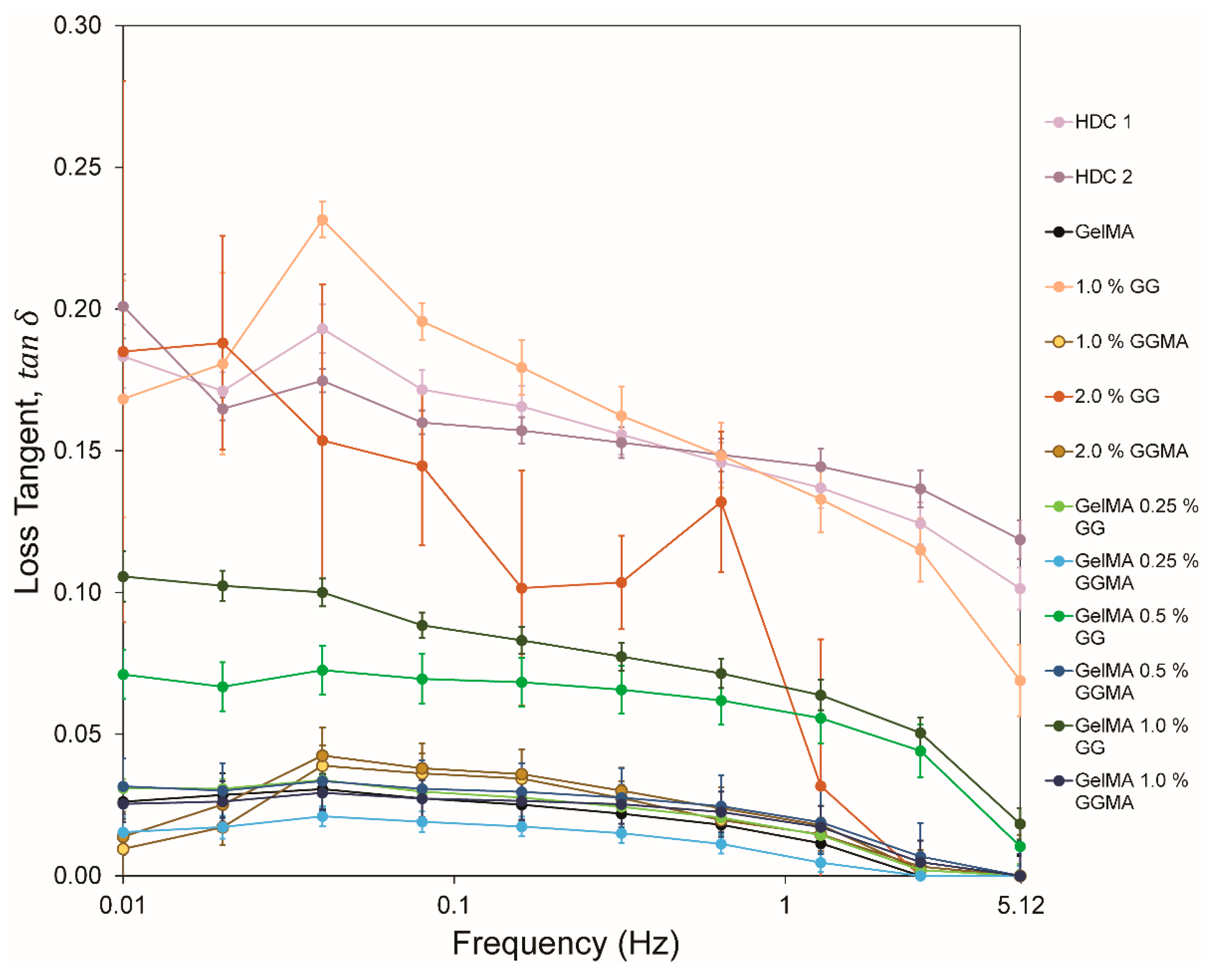 Figure 6), as the loss tangent illustrates the ratio of loss to storage moduli. It was clear that the majority of hydrogel groups in this study did not consistently produce a large viscoelastic response, with only GelMA/0.5% GG, GelMA/1.0% GG, 1.0% GG and 2.0% GG achieving values above 0.05, or being comparable with native tissues. The consistency of loss tangent exhibited in native tissues is clear, with a decrease from ~0.2 to ~0.1 observed in the samples. Conversely the hydrogels show a much greater decrease over the frequency range, with 1.0% GG appearing closest to native values. Whilst 2.0% GG appeared somewhat variable over the range, the data suggest that stabilization of a higher concentration of GG within GelMA may reveal trends more similar to native tissue.
